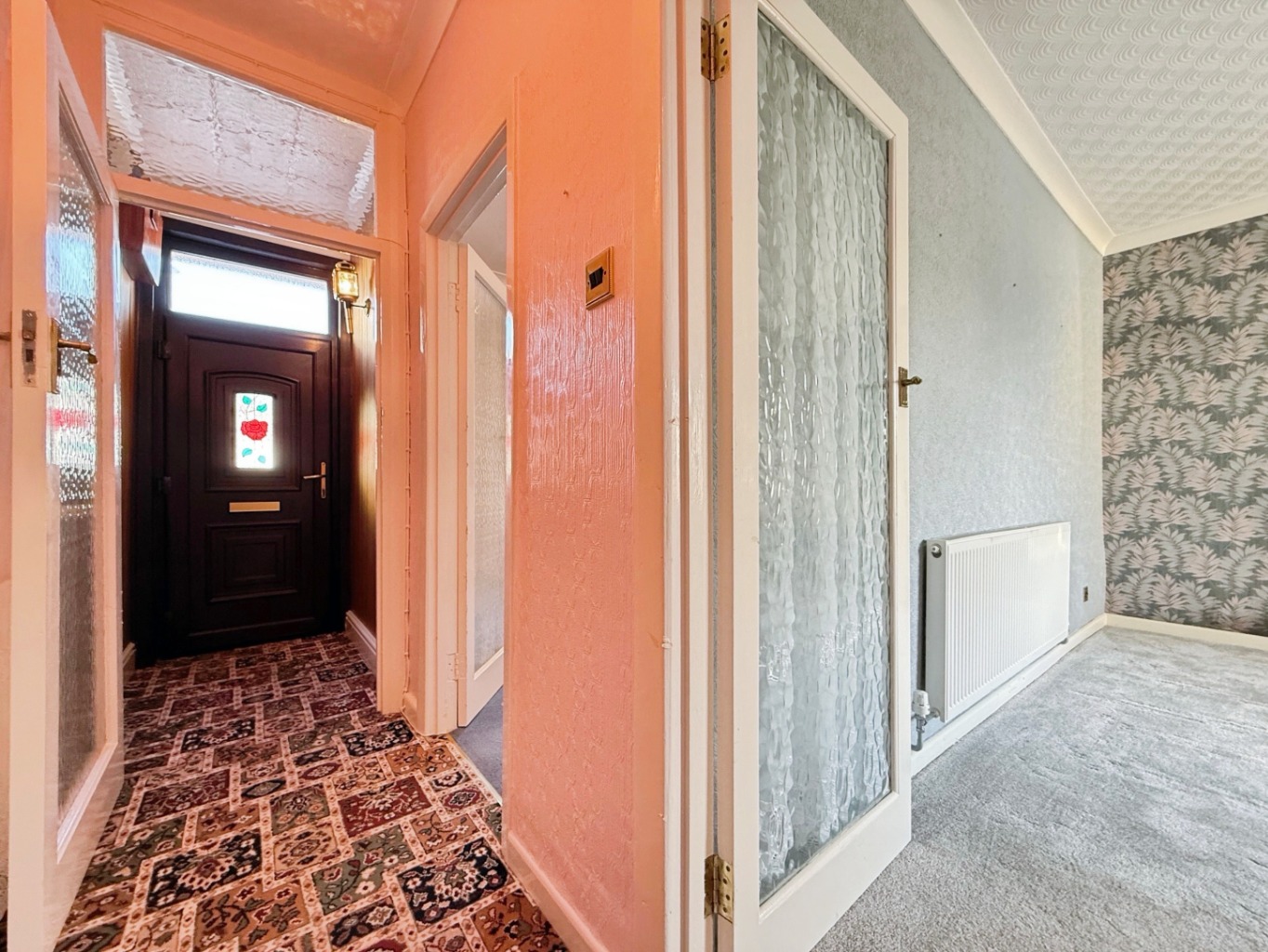 Carpeted underfoot, radiator, uPVC double glazed window to rear elevation, understairs storage cupboard, coving to ceiling, door into: