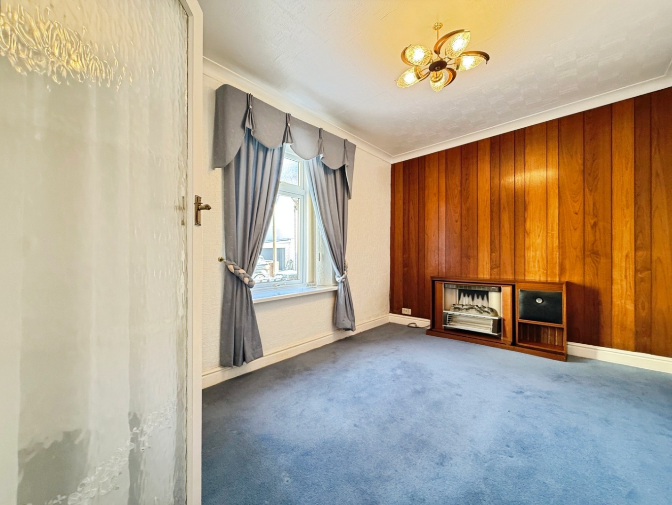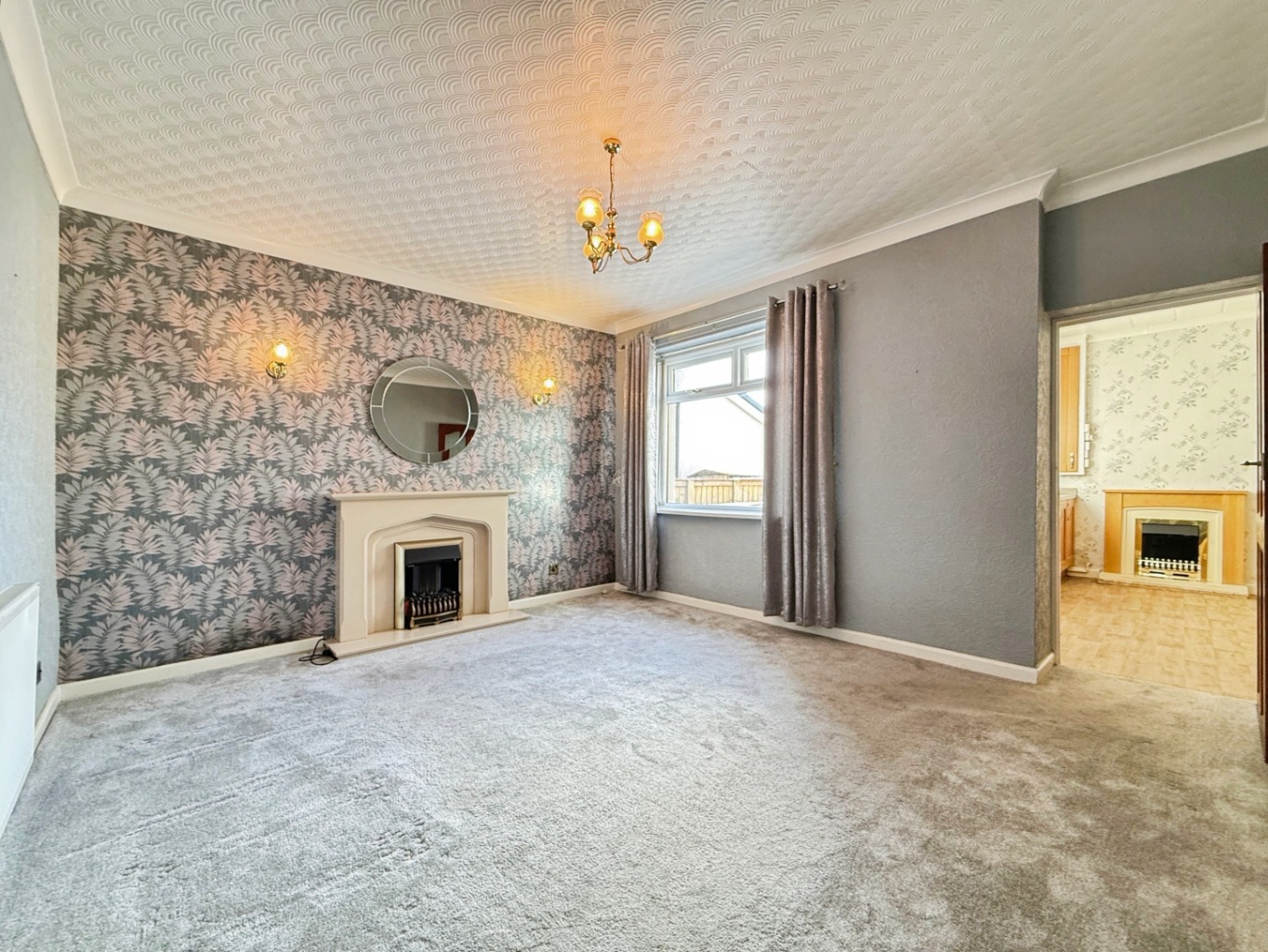 Carpeted underfoot, feature electric fireplace, uPVC double glazed window to front elevation, paneled wall, radiator.