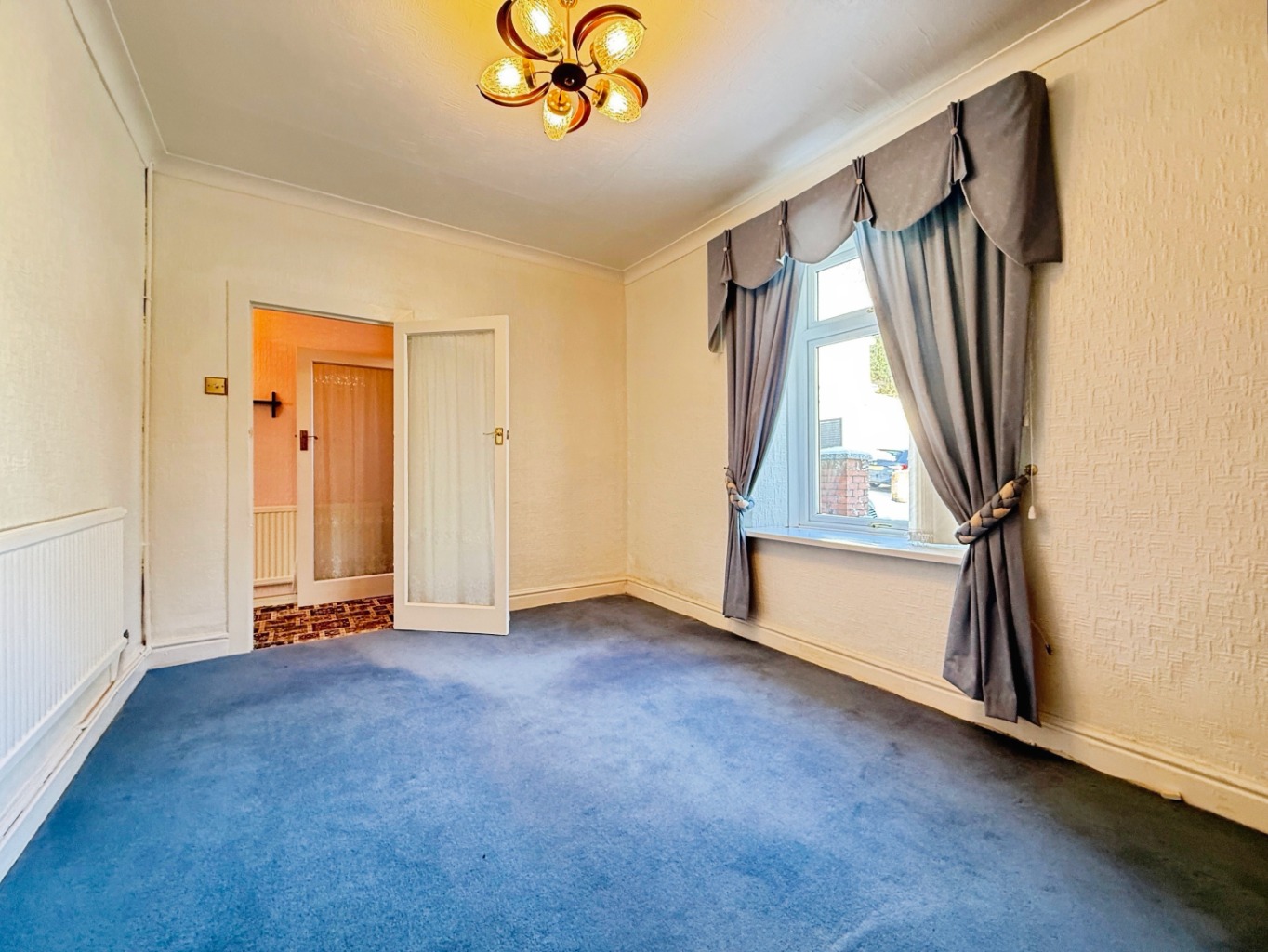 Carpeted underfoot, radiator, loft access, doors into: