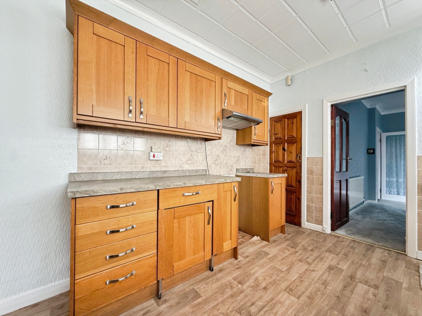 Fitted with a range of matching wall and base units with work surface over, stainless steel sink with mixer tap, tiled splash back, space for freestanding fridge/freezer and cooker with extractor above, decorative fireplace, cupboard housing gas combination boiler, space for washing machine, under stairs storage cupboard, uPVC double glazed window and door to side elevation.
