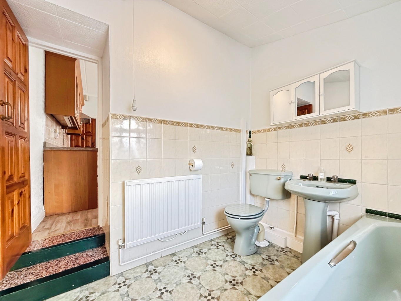 Fitted with a three piece suite comprising of W/C, pedestal wash hand basin, panelled bath, tiled walls, radiator, uPVC double glazed window to rear elevation.