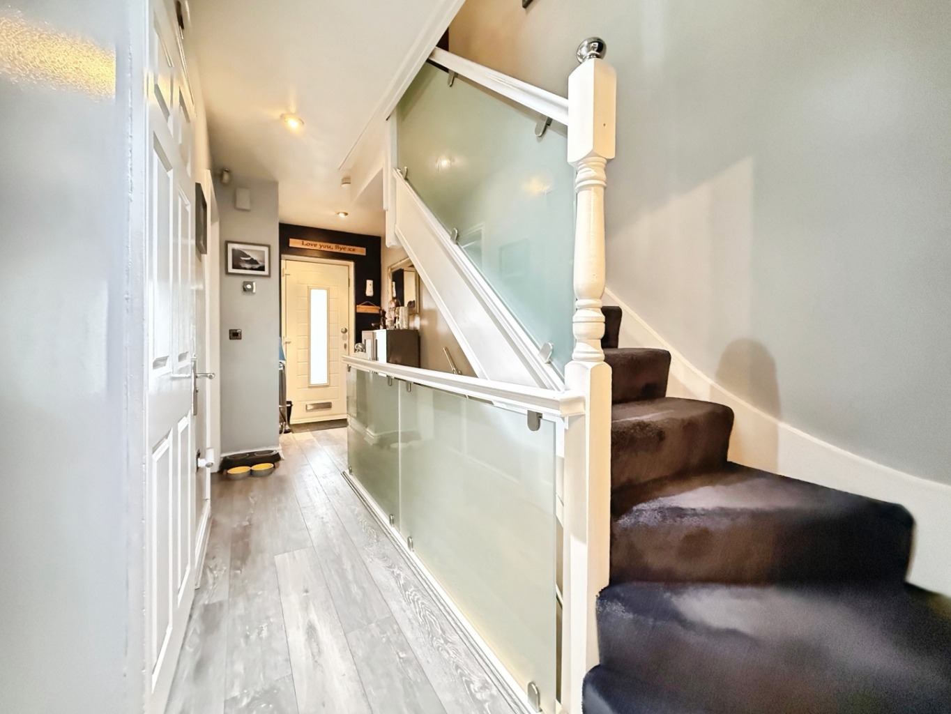 LVT flooring underfoot, radiator, glass balustrade, staircase to lower ground floor and first floor accommodation, door into: