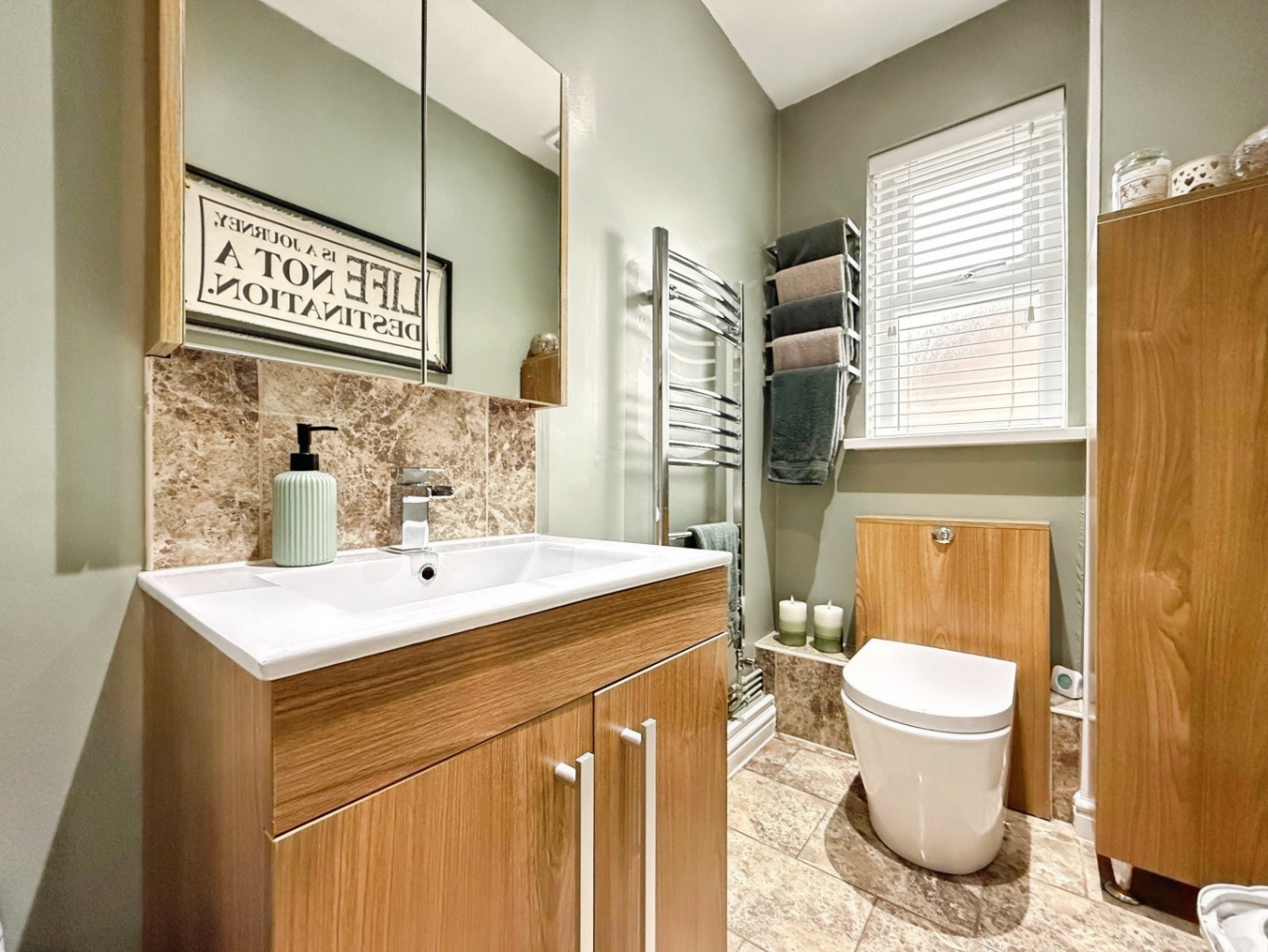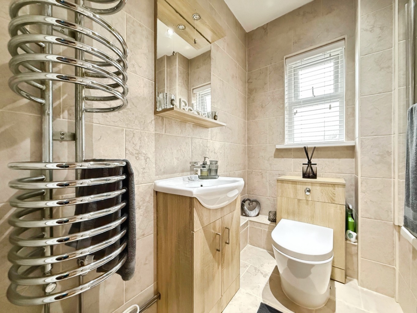 Fitted with a white three piece suite comprising of W/C, sink set in vanity unit, tiled flooring, polished chrome heated towel rail, uPVC double glazed frosted window to side elevation.