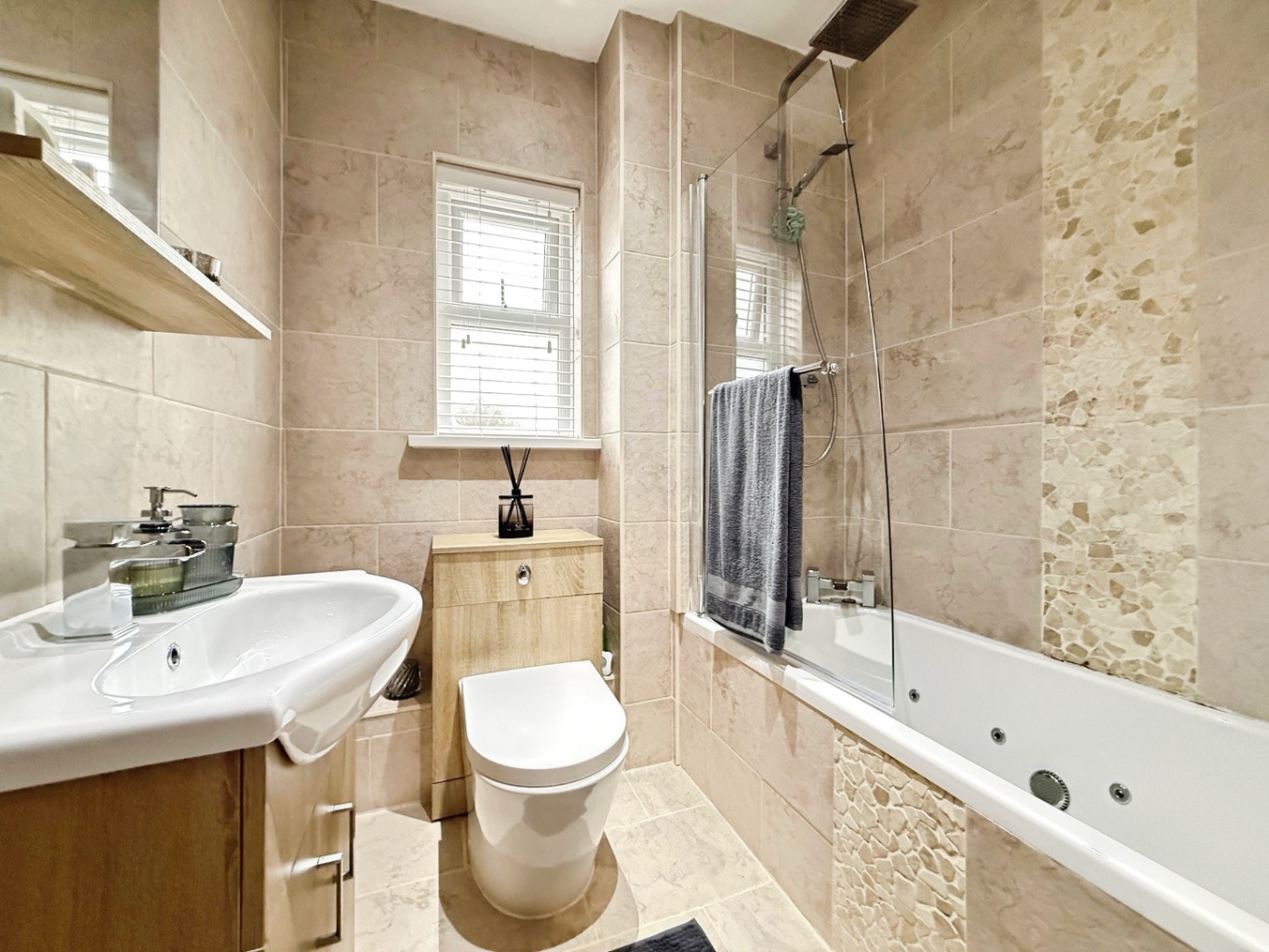 Fitted with a white three piece suite comprising of W/C, sink set in vanity unit, paneled bath with shower overhead and glass modesty screen, tiled flooring and tiled walls, polished chrome heated towel rail.