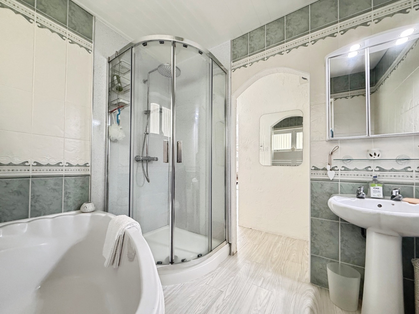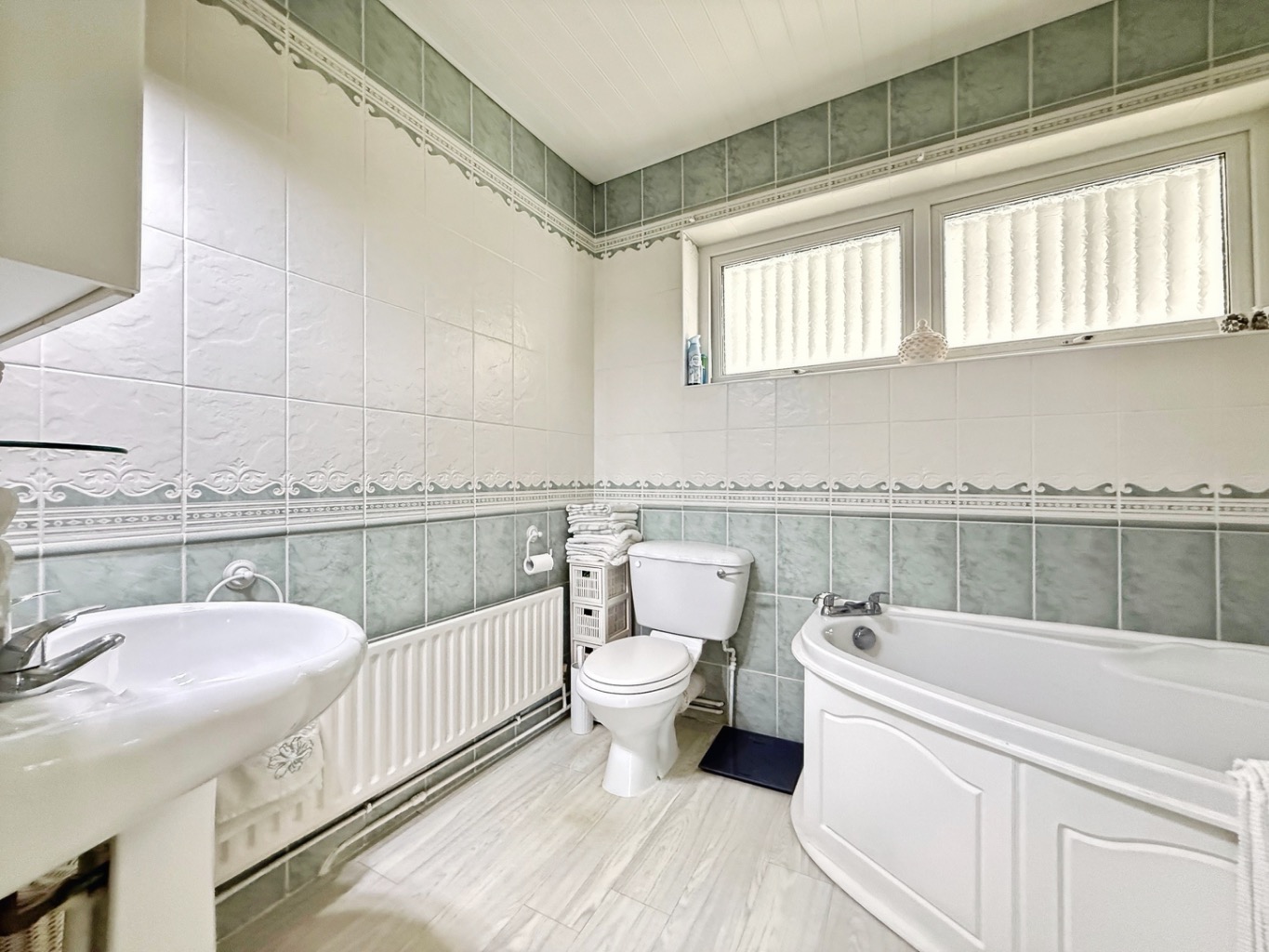 Fitted with a white four piece suite comprising of W/C, pedestal wash hand basin, corner bath, corner shower enclosure, fully tiled walls, airing cupboard, gas combination boiler, radiator, uPVC double glazed frosted window to rear elevation.