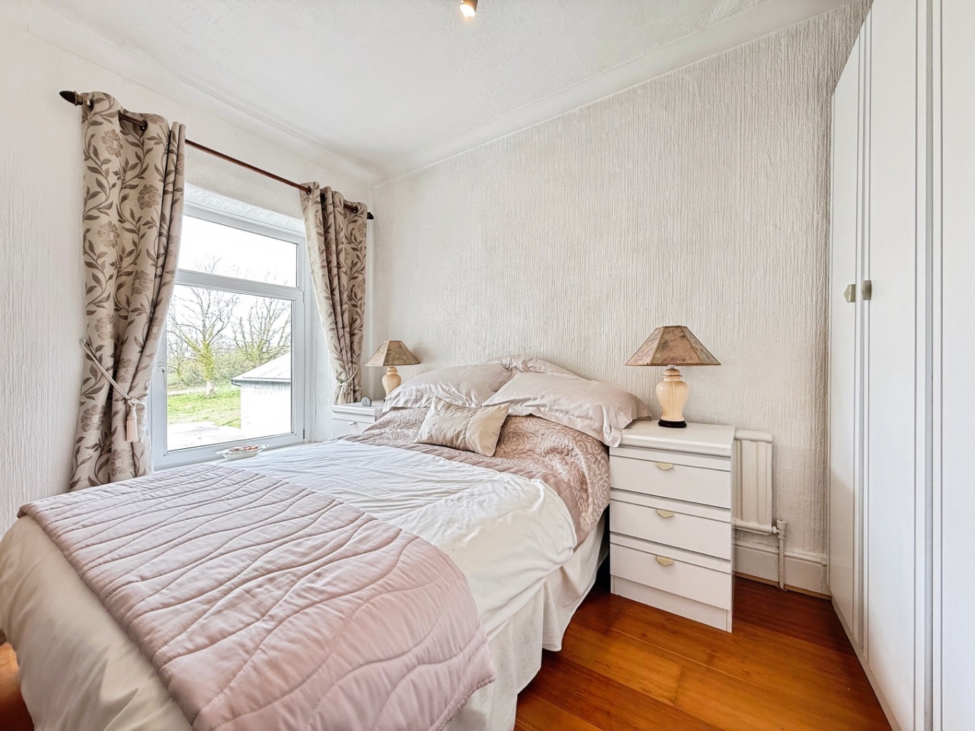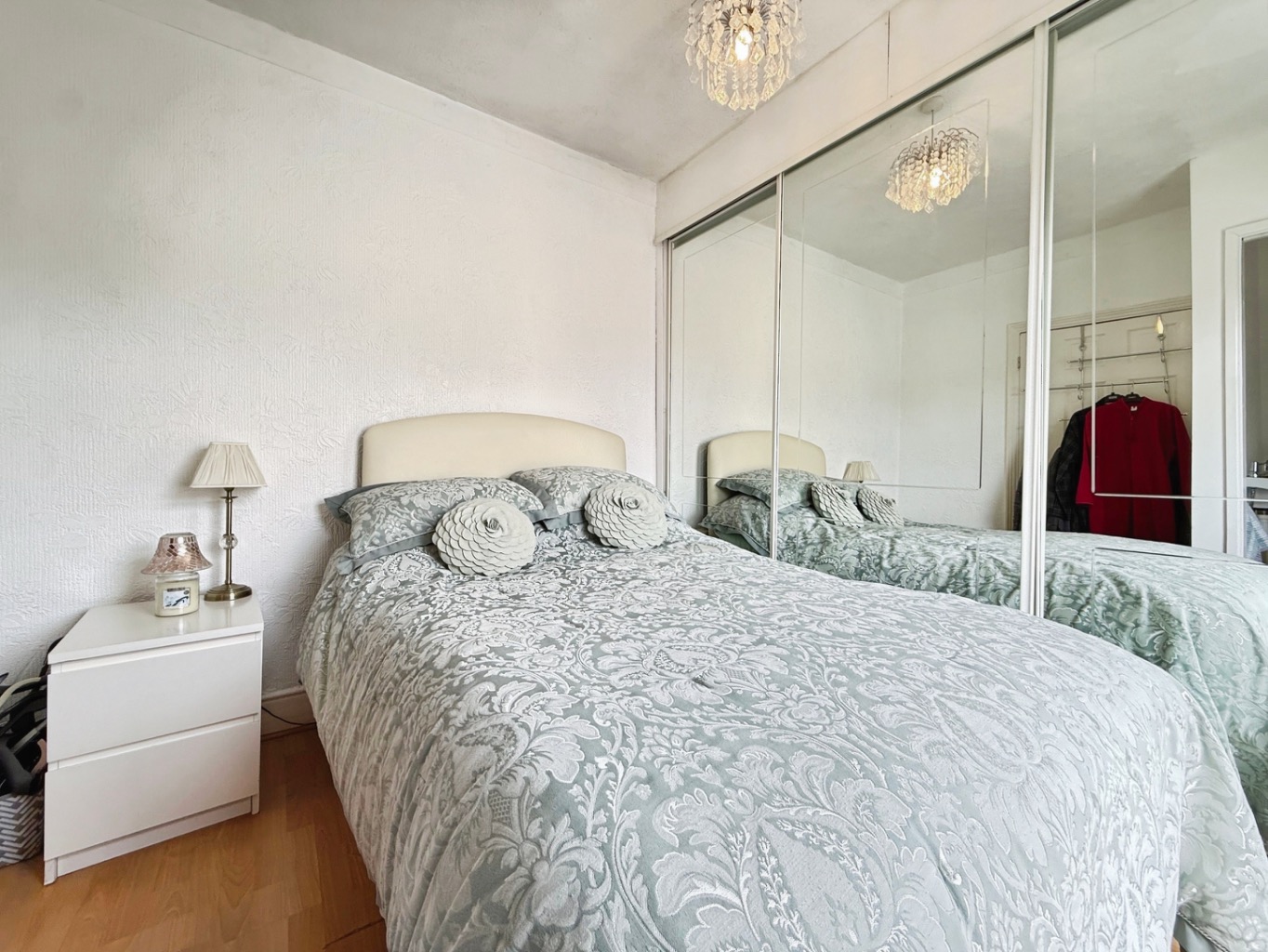 Laminate flooring underfoot, radiator, mirrored sliding wardrobes, uPVC double glazed window to side elevation.