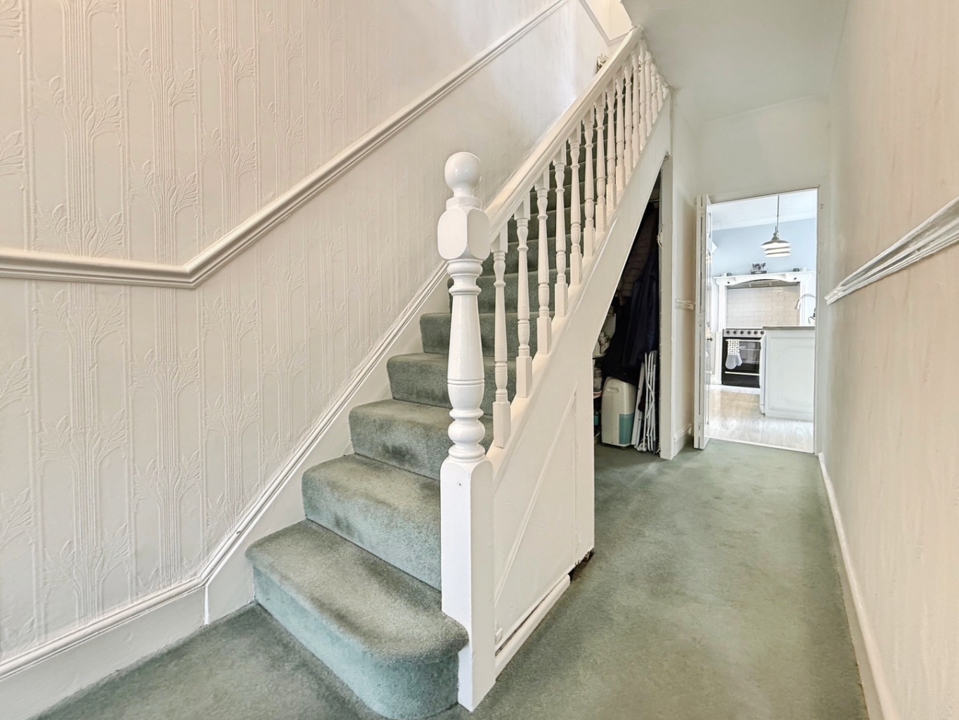 Carpeted underfoot, radiator, stairs to first floor accommodation, dado rail, coving to ceiling, under stairs storage area, doors into:
