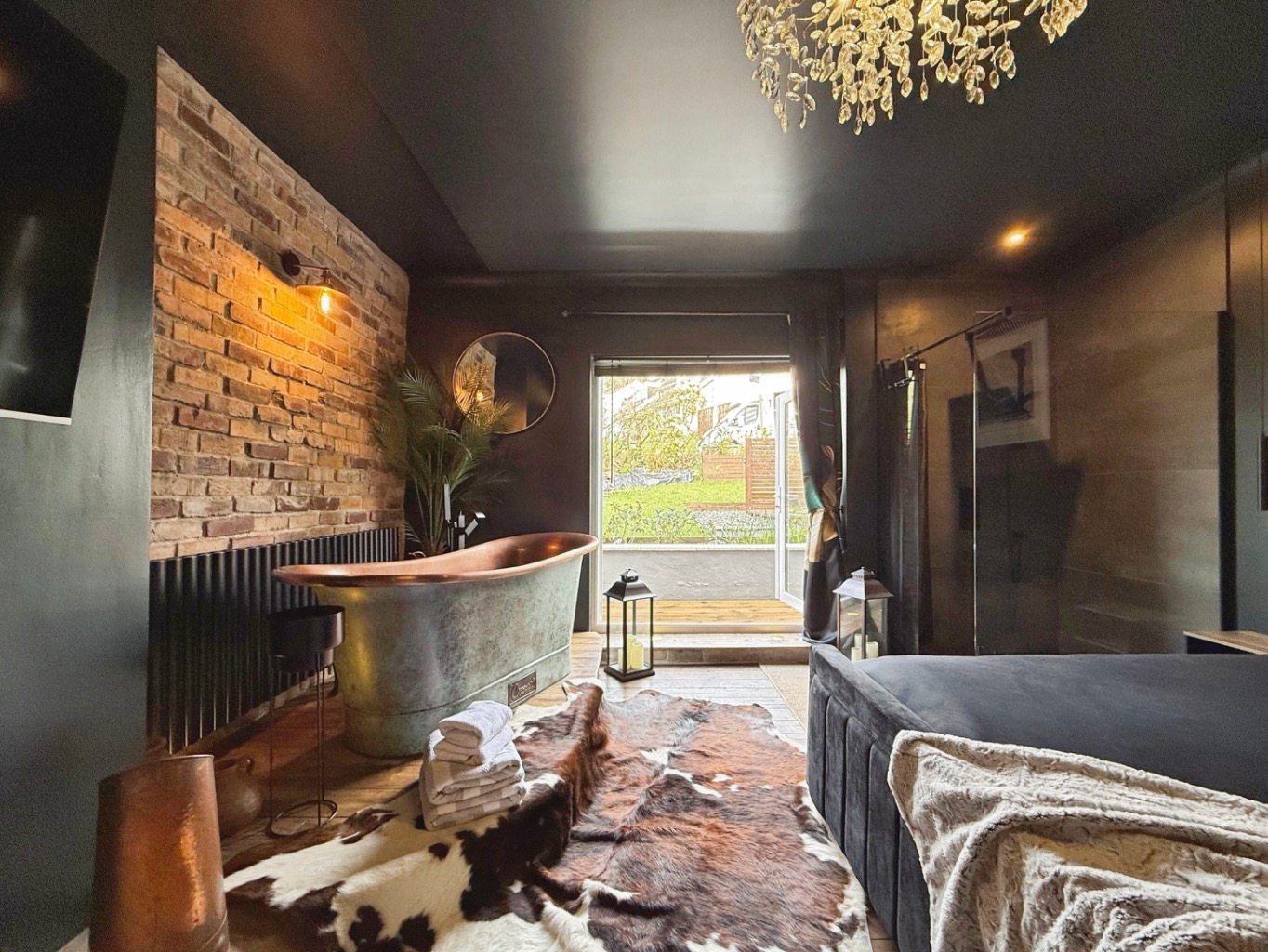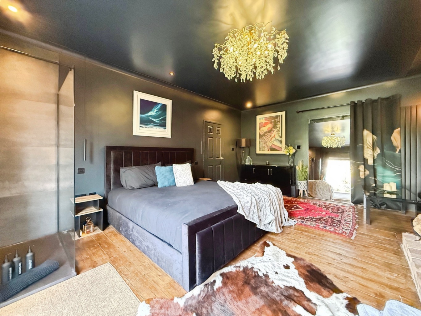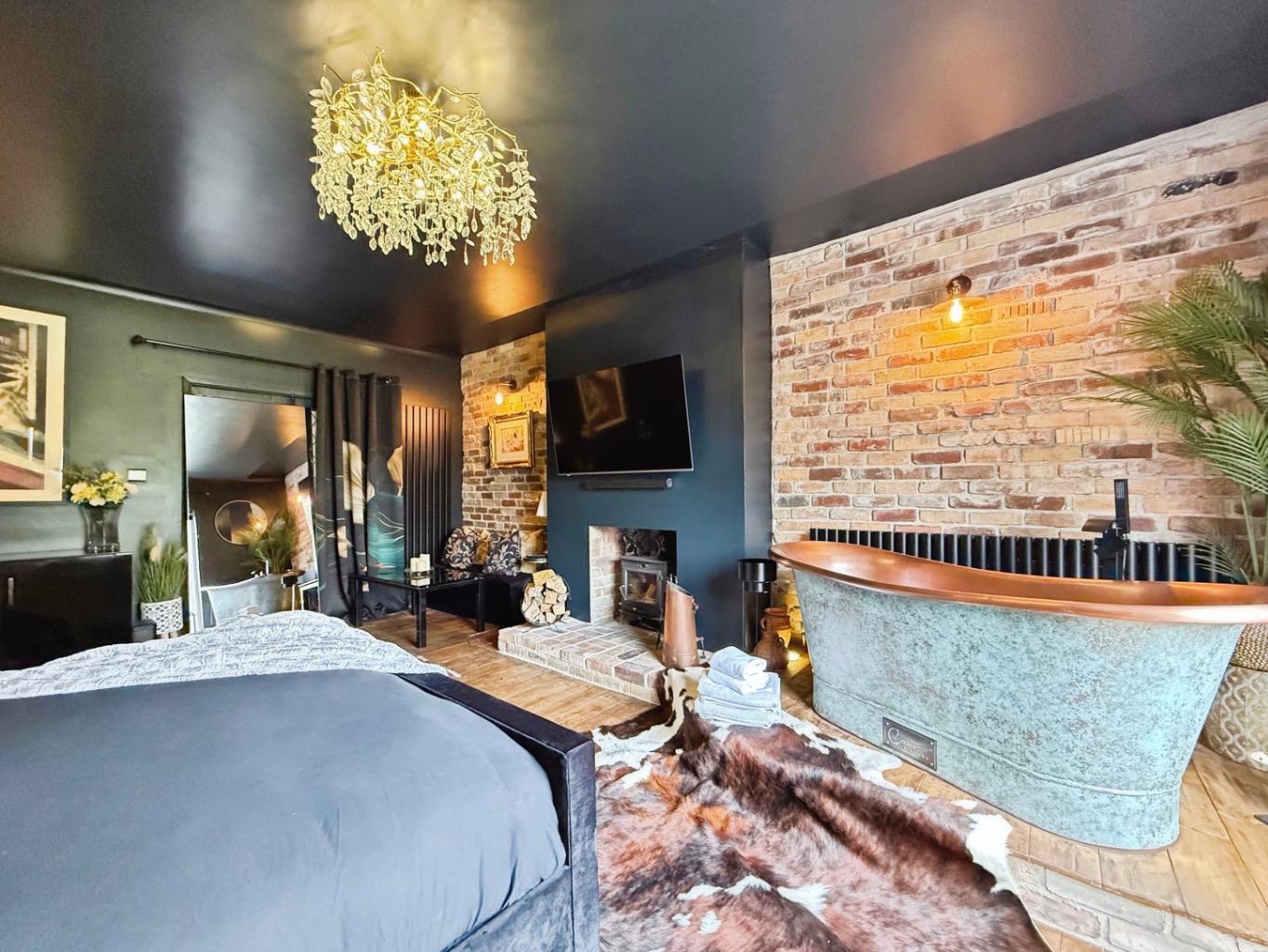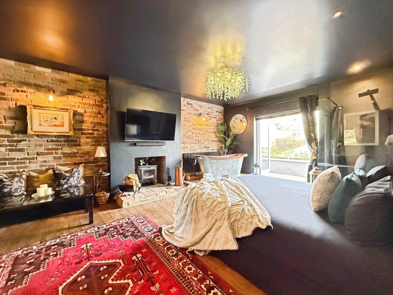The standout principal suite is nothing short of indulgent, featuring a striking copper bath and a sleek rainfall shower, creating a spa-like sanctuary. A cosy log-burning stove and intimate seating nook add warmth and charm, perfect for unwinding. Elegant French doors open directly onto a tranquil, private front garden, where a picturesque pond, landscaped planting, and a secluded patio provide the ideal setting for morning coffee or evening drinks.