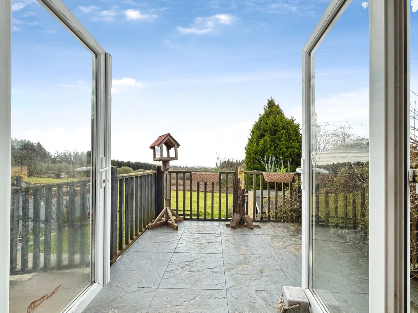 Laminate flooring, uPVC double glazed construction with patio doors to rear patio area with scenic views, radiator.