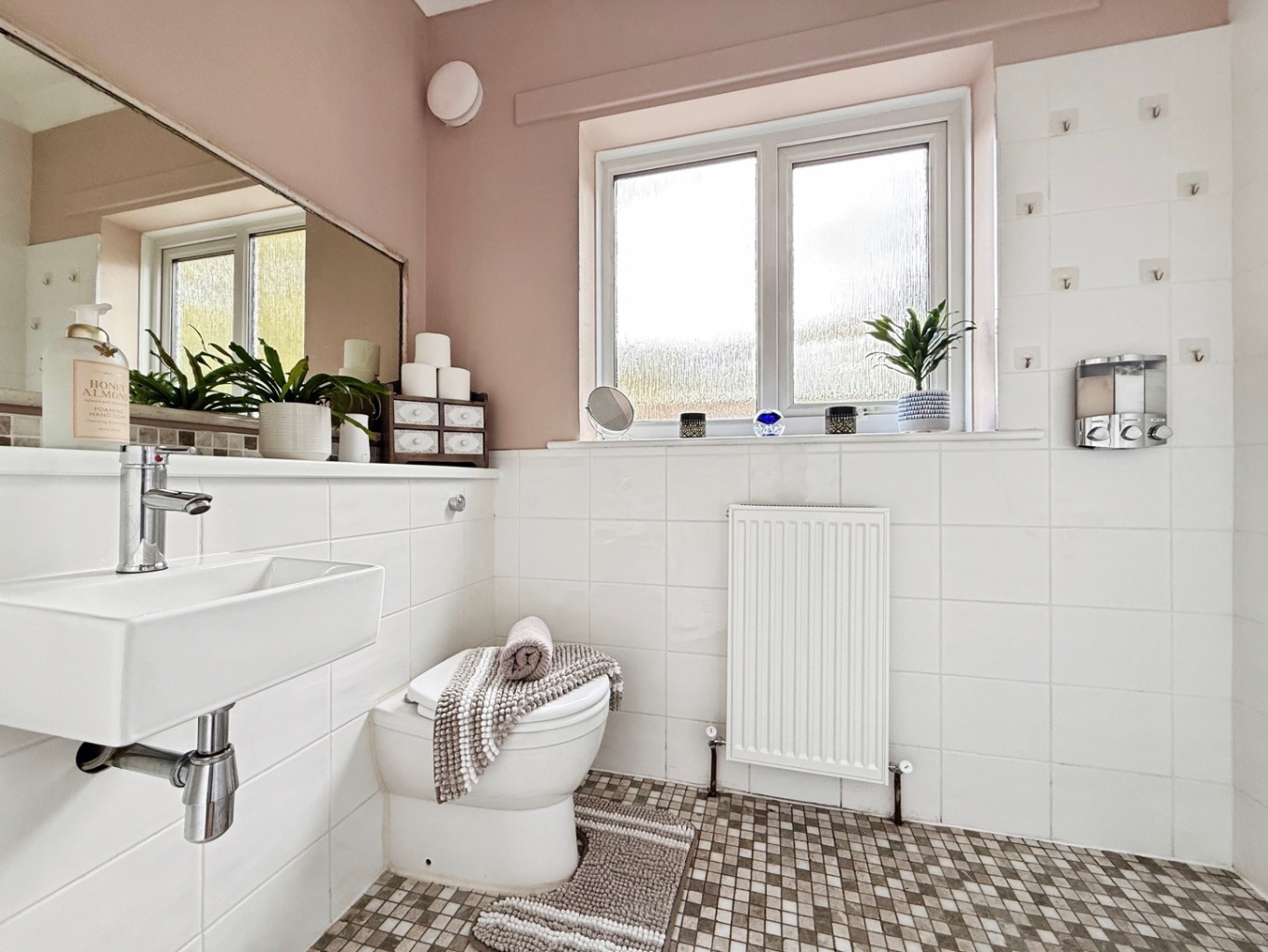 Fitted with a stylus suite comprising of W/C, sink set in vanity unit with marble counter top, walk in shower with glass modesty screen and rainfall shower, partly tiled walls, spotlights to ceiling, freestanding bath with polished chrome mixer tap, radiator, uPVC double glazed frosted window to rear elevation.