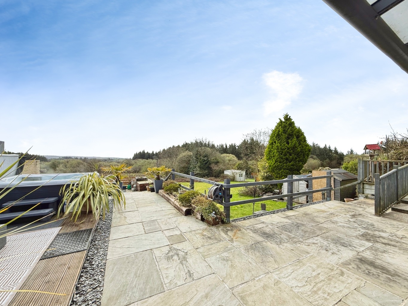 To the rear of the property there is a stunning garden featuring multiple seating areas and lawn space with scenic views over forestry. Featuring large Indian sandstone patio with covered outdoor pergola seating areas, decking with area for hotub, outdoor lighting.