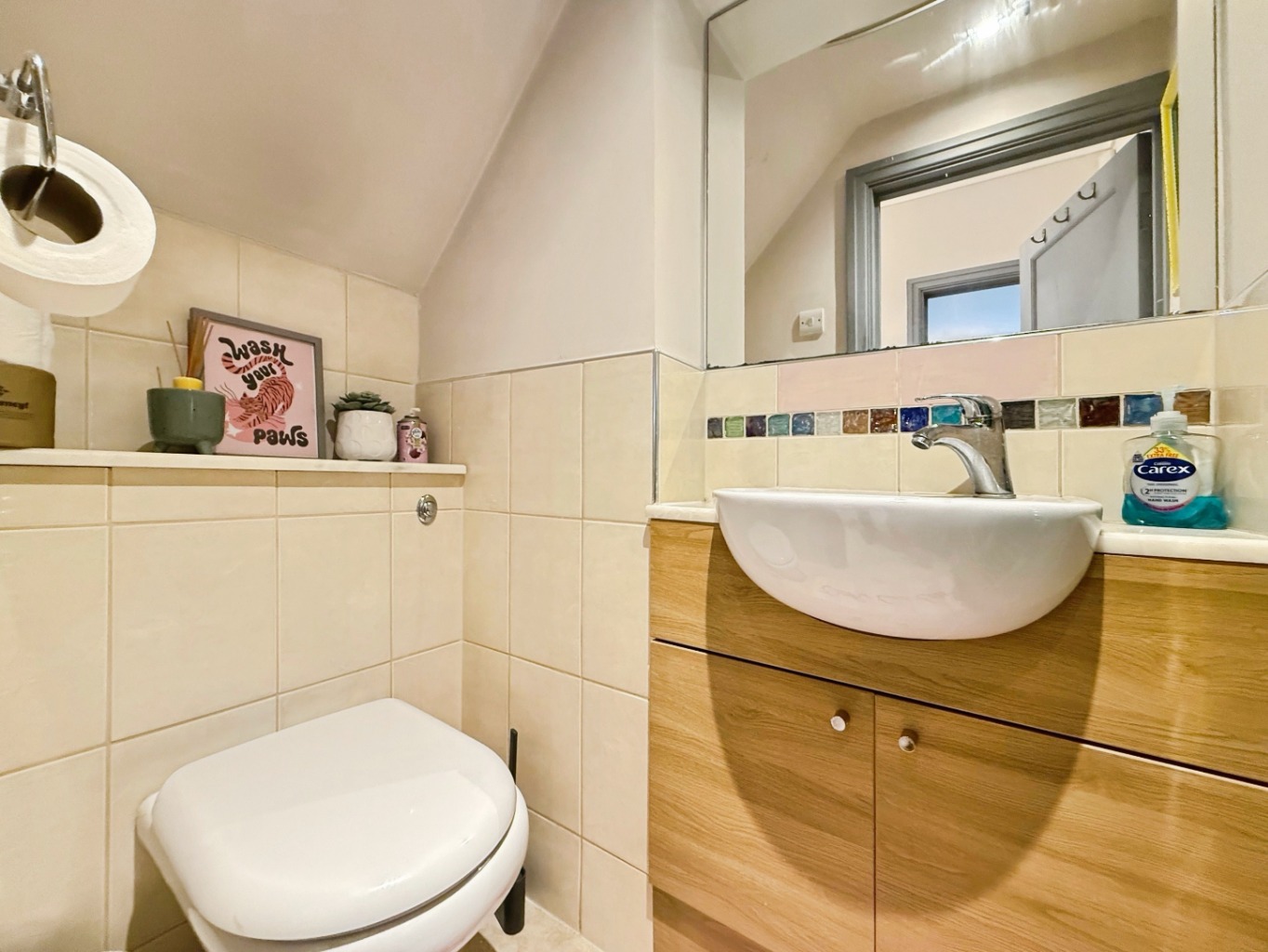 Fitted with a white two piece suite comprising of W/C, sink set in vanity unit, tiled flooring.