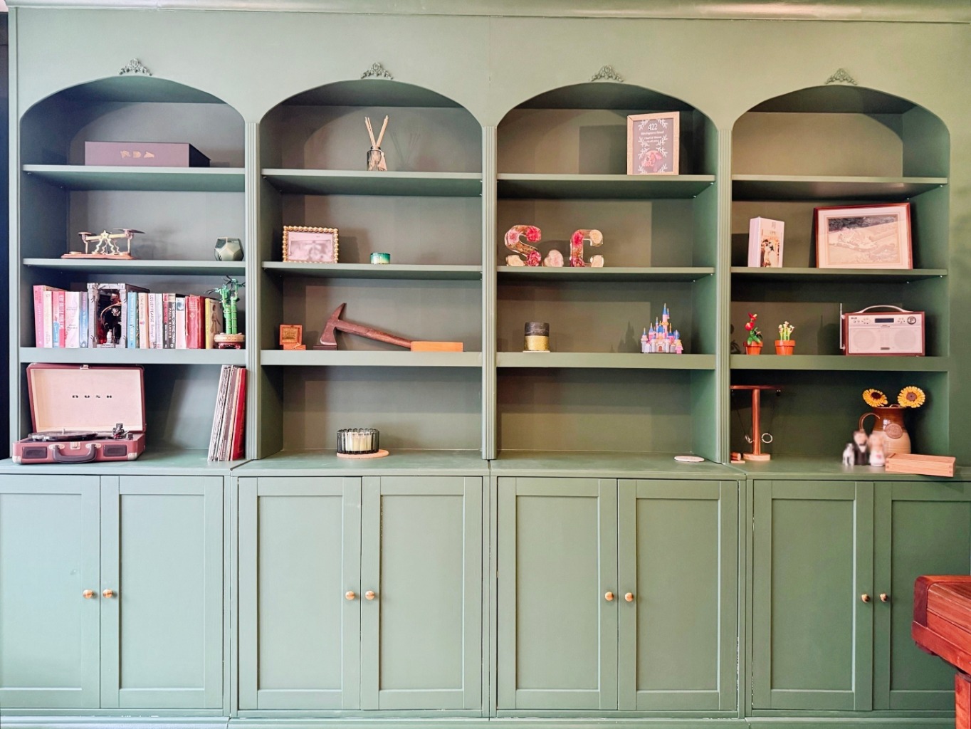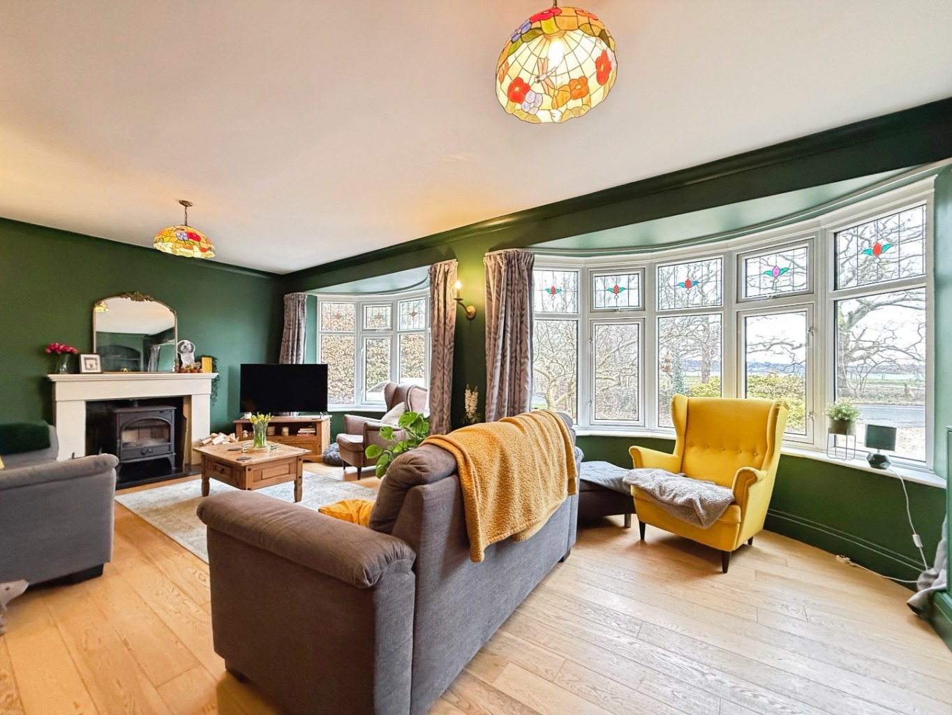 Wooden flooring, uPVC double glazed bay style windows to front elevation x2, feature wood burner, underfloor heating, built in storage wall with cupboards and alcove shelving.