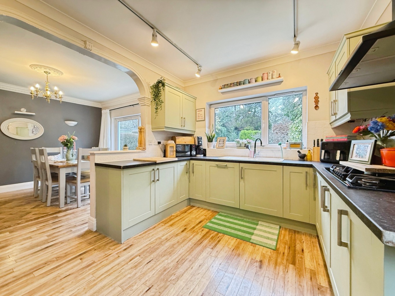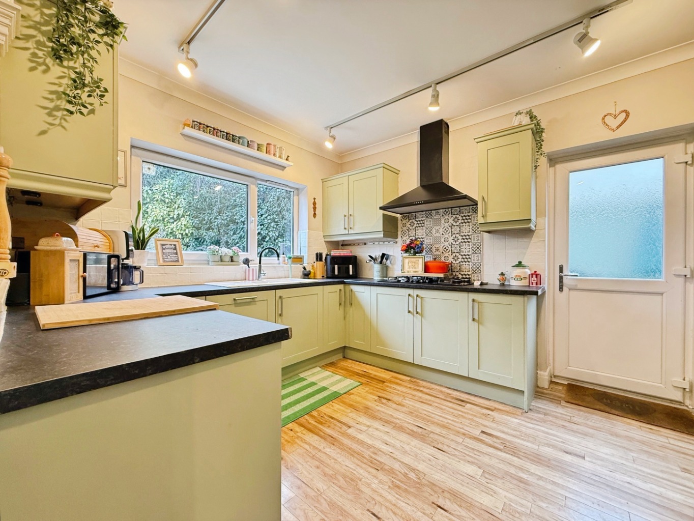 Fitted with a range of matching wall and base units with complimentary work surface over, white 1 1/2 bowl ceramic sink with mixer tap, five ring gas hob with extractor fan over, integrated oven, integrated dishwasher, space for American style fridge/freezer, tiled splashback, wooden style flooring.