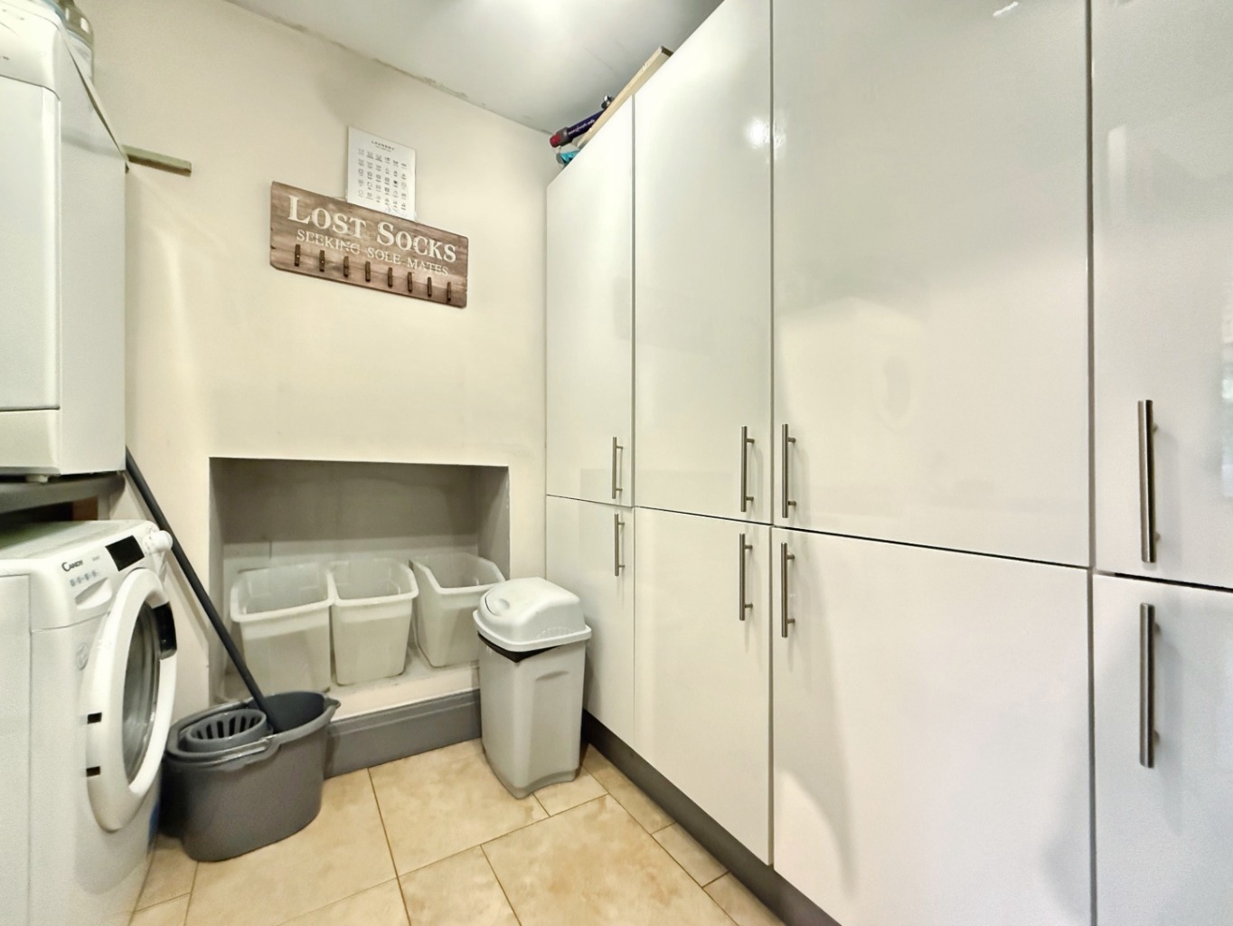 Fitted with a range of matching wall and base units with area with worktop over, plumbing for washing machine, space for tumble dryer, chrome heated towel rail, tiled flooring.
