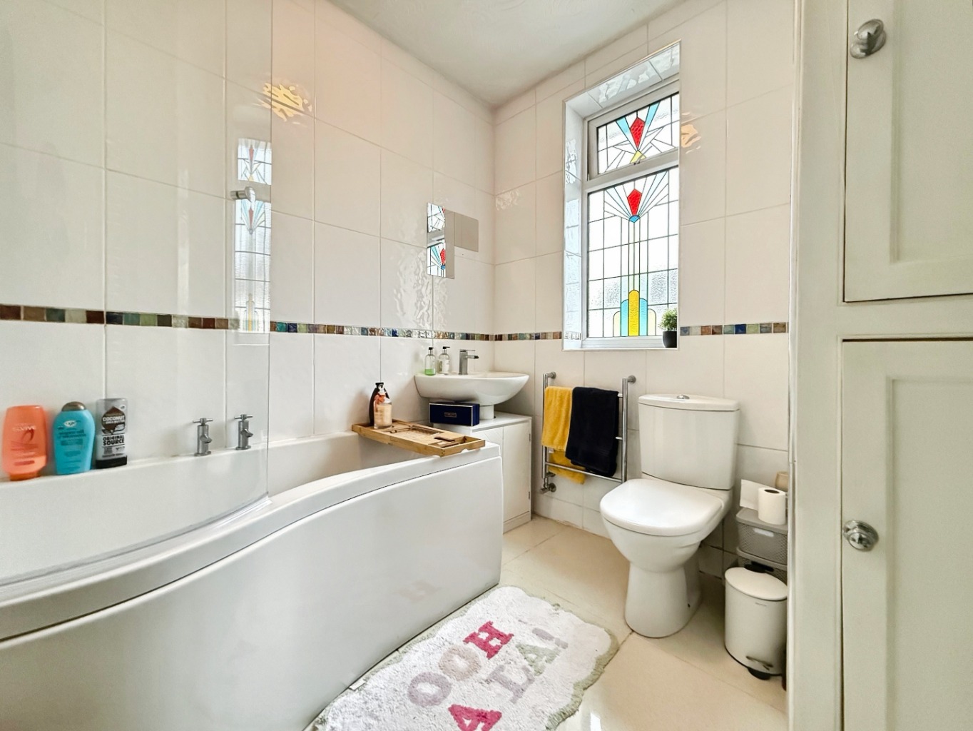 Fitted with a white three piece suite comprising of W.C, wash hand basin, 'P' shape bath with shower over head with glass modesty screen, tiled walls and flooring, heated towel rail, cupboard housing gas combination boiler, uPVC double glazed stained glass window to side elevation.
