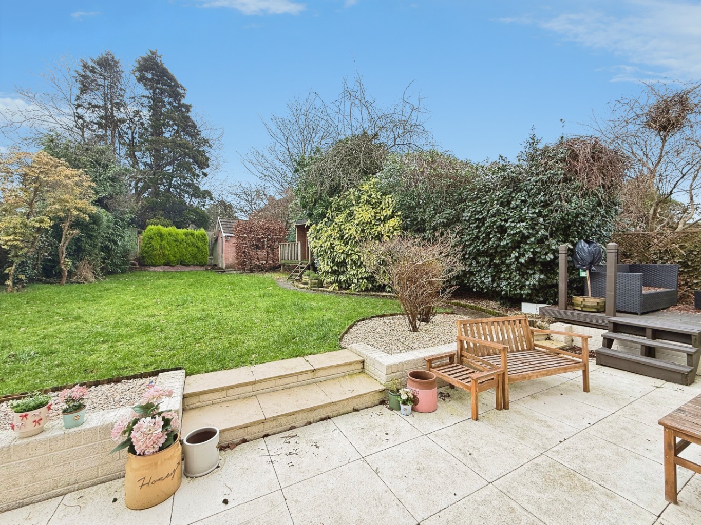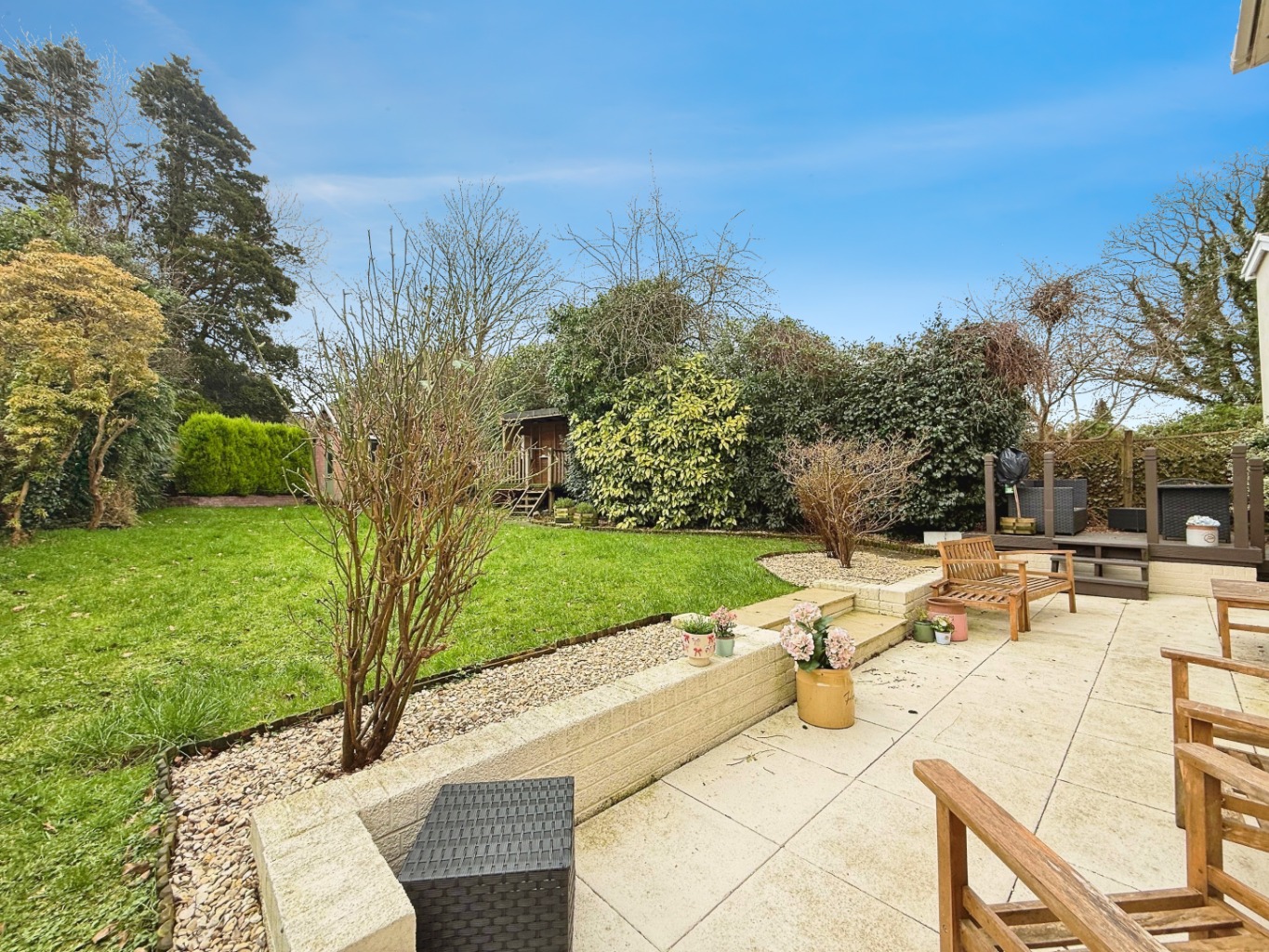 To the rear of the property there is a good sized private garden laid to patio, lawn space and hedgerow boarder, raised decking area, large patio area to side. Shed to rear featuring power and electricity.