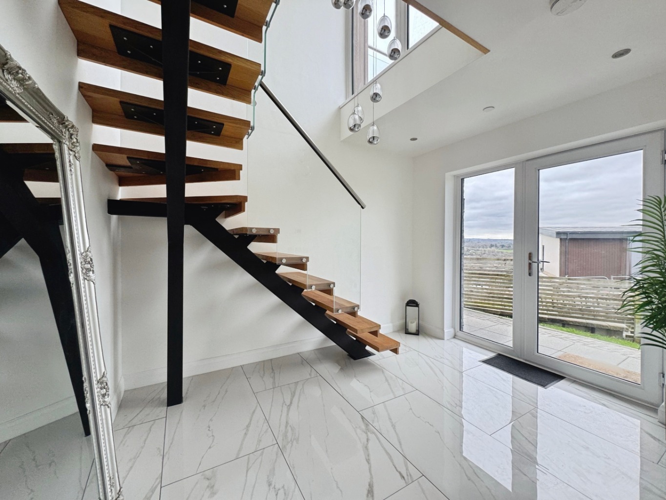 Tiled floor, oak cantilever style staircase with glass balustrade spotlights to ceiling, underfloor heating, door to cupboard housing underfloor heating controls and pipes and sprinkler info, doors to: