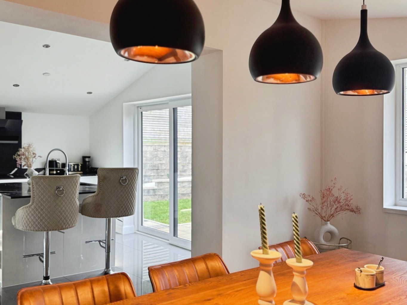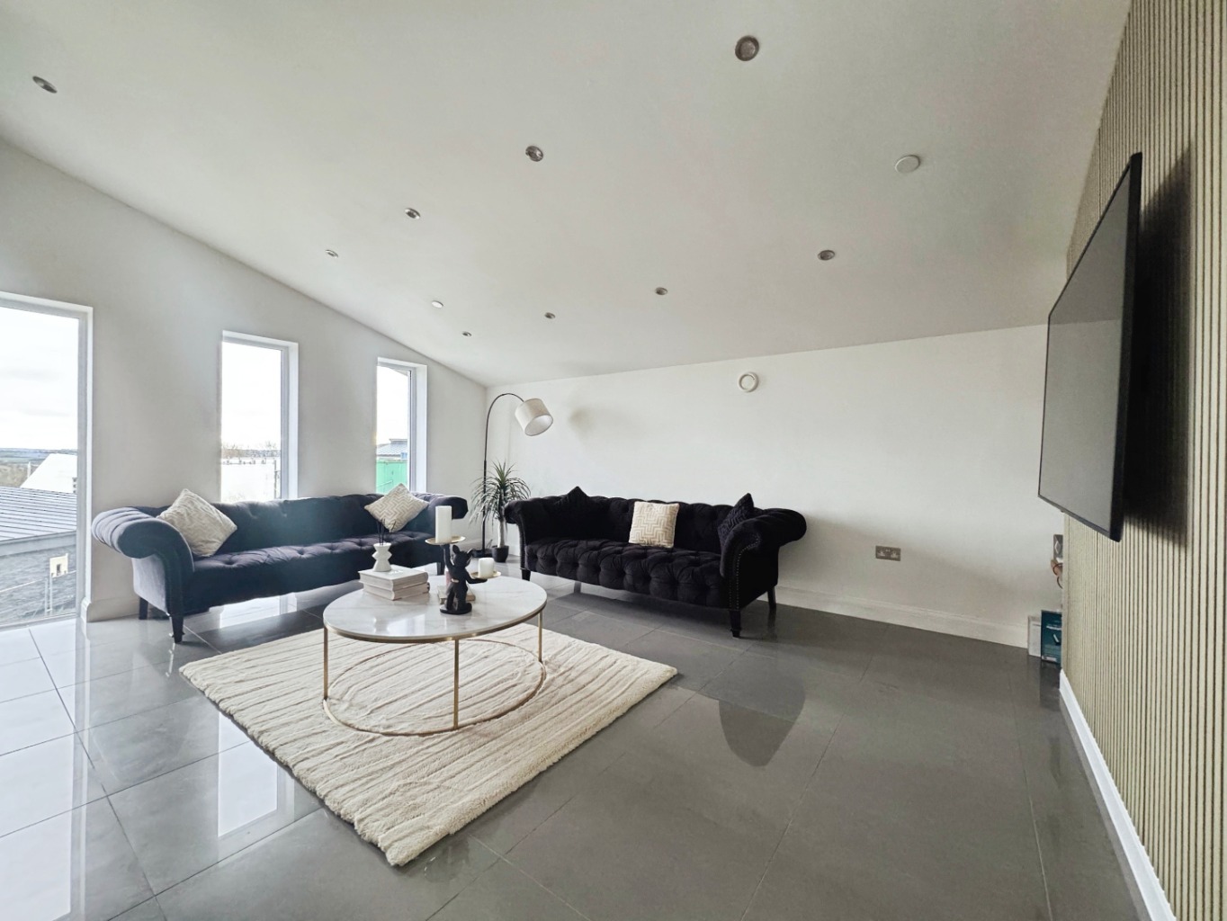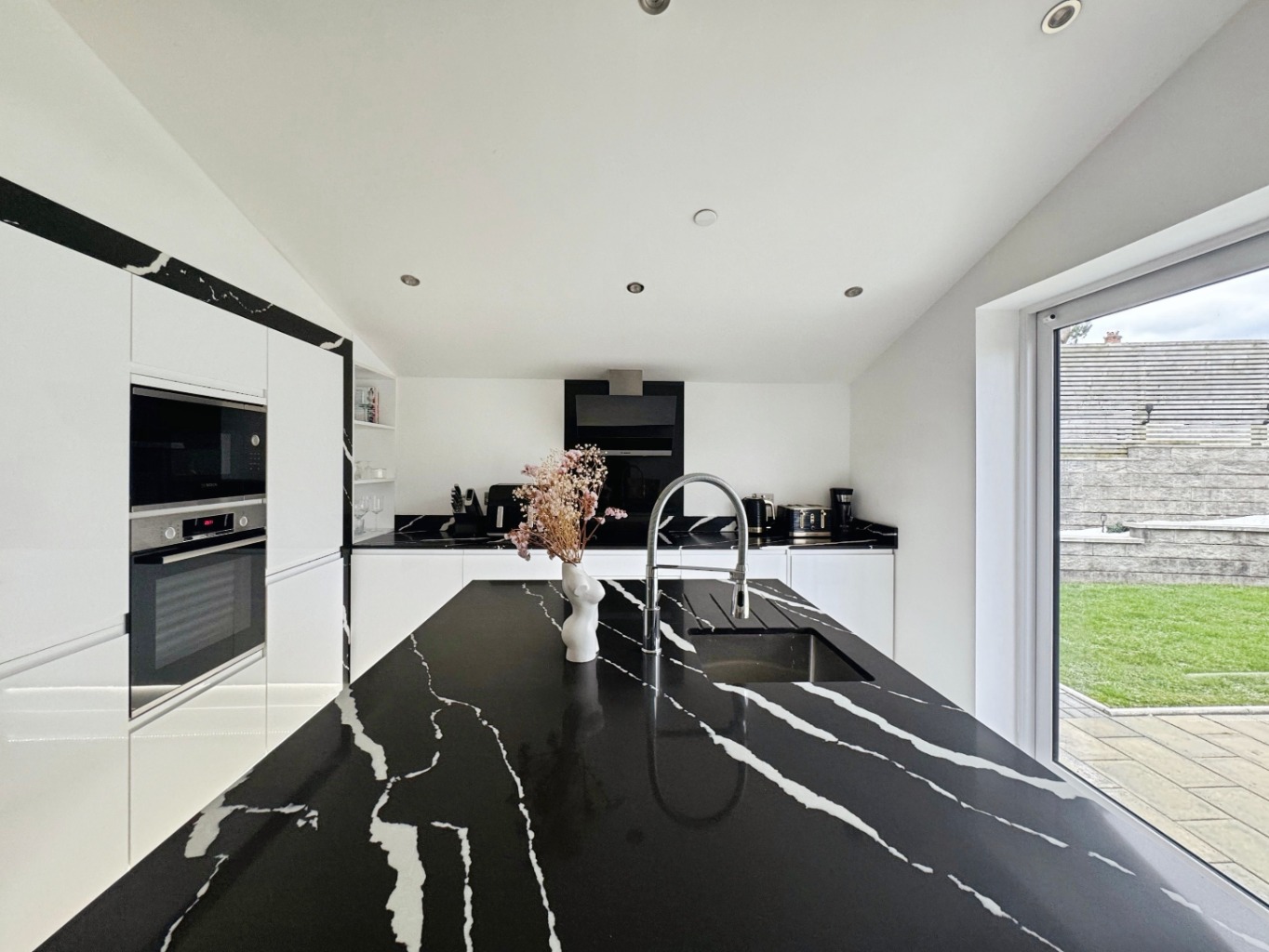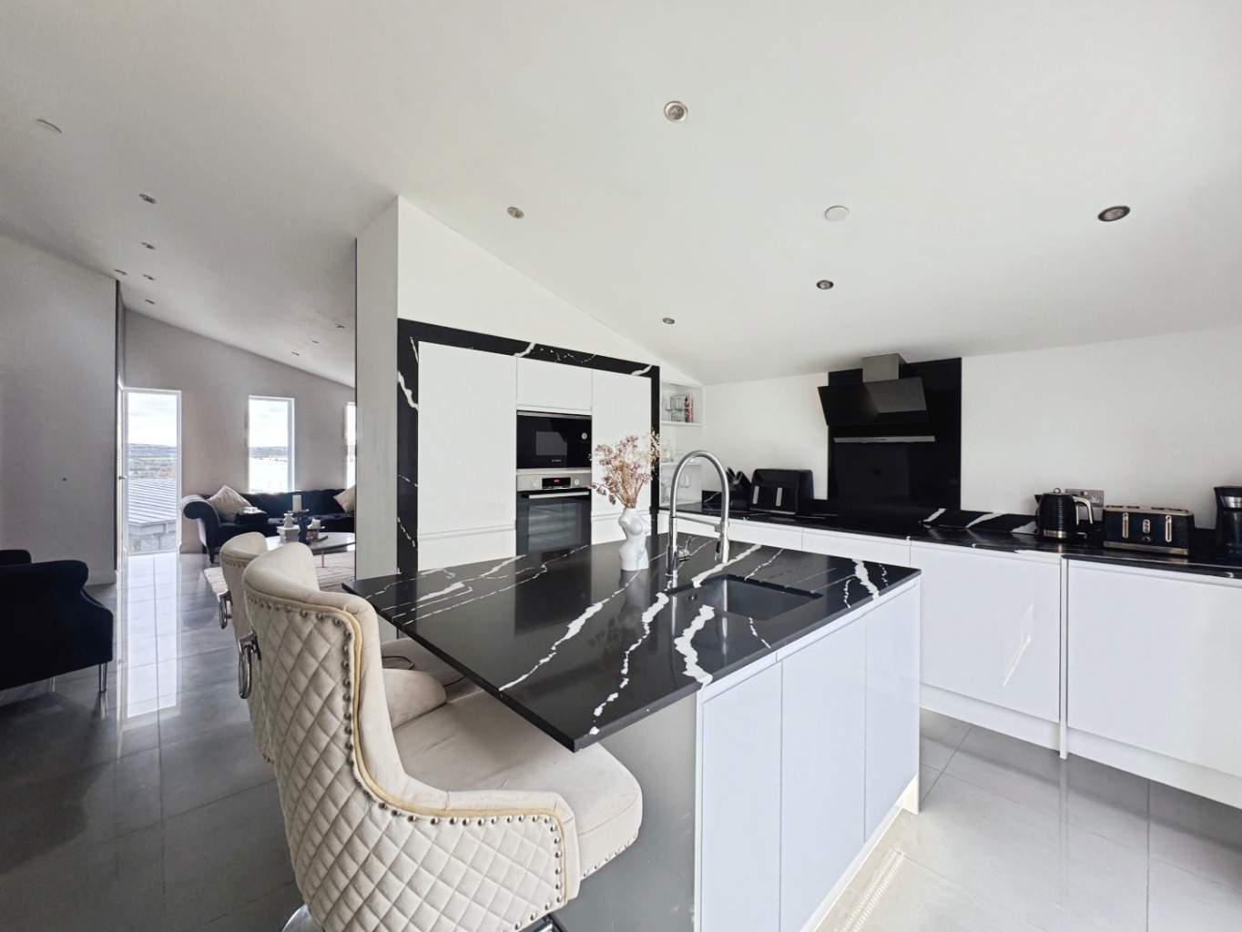 Ascending to the upper floor, you discover the heart of this home, a magnificent open-plan living space designed for connection and effortless flow. The lounge, kitchen, and dining areas merge harmoniously, creating an inviting environment perfect for entertaining friends, enjoying family meals, or simply unwinding after a busy day. The statement kitchen is a true highlight, featuring honed black quartz worktops that exude luxury and a generously sized island, making it an ideal hub for culinary creativity and social gatherings. Imagine preparing delicious meals while still being part of the conversation, or gathering around the island for casual breakfasts.