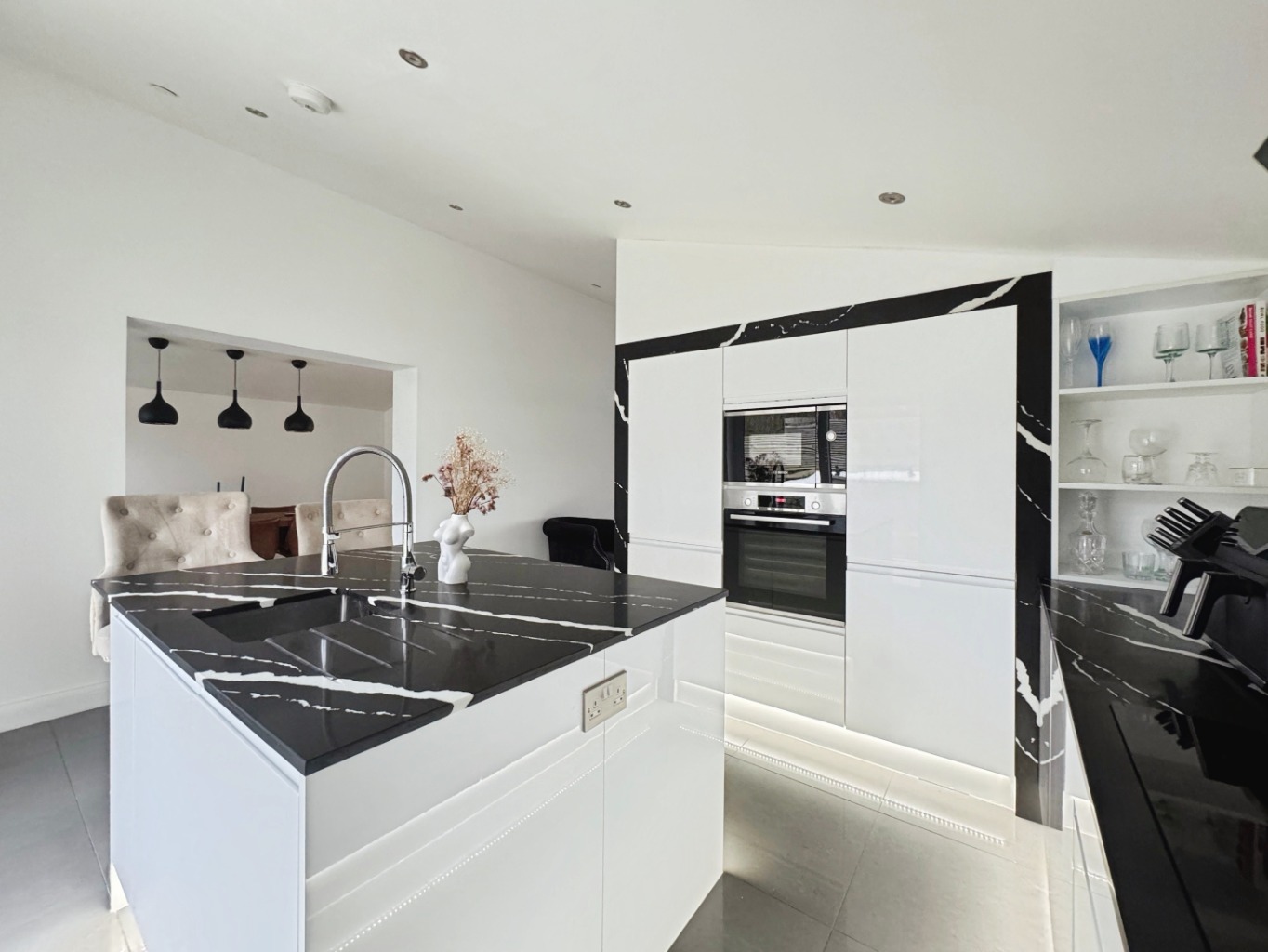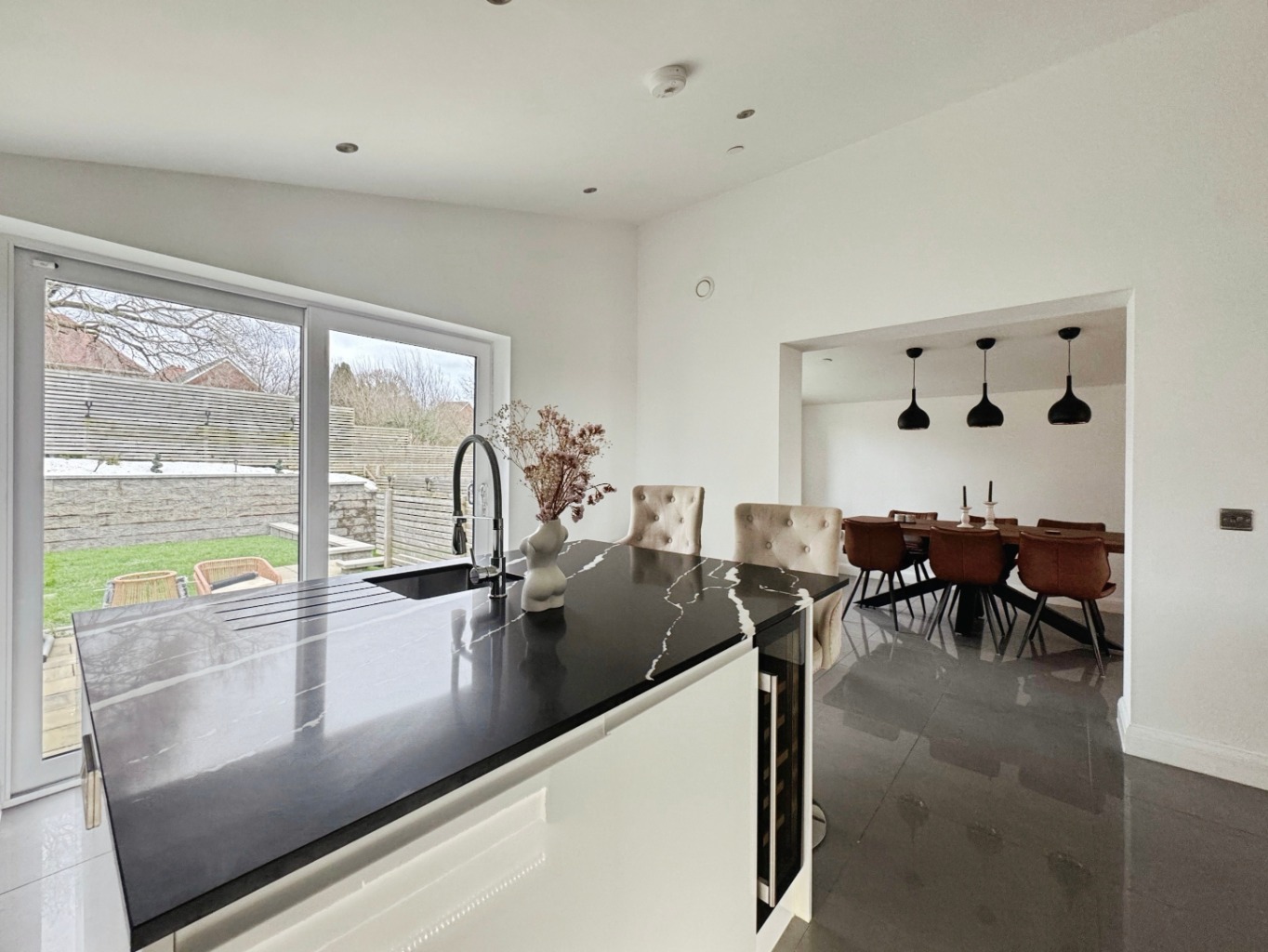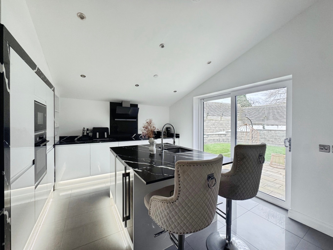 Fitted with a range of modern high gloss wall and base units with quartz work surface over, kitchen island housing inset steel sink with pull down tap, storage cupboard, breakfast bar and wine cooler, eye level integrated microwave and oven, integrated fridge/freezer, touring induction hob with extractor fan over, integrated dishwasher, integrated washer/dryer, tiled floor, uPVC double glazed sliding patio doors, spotlights to ceiling, underfloor heating, opening through into: