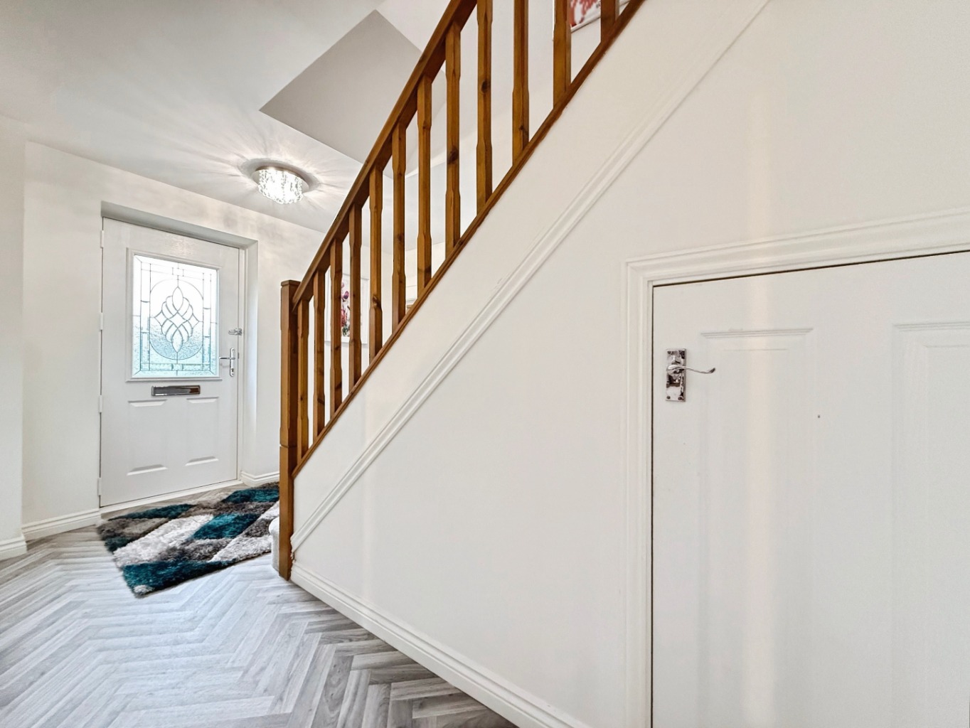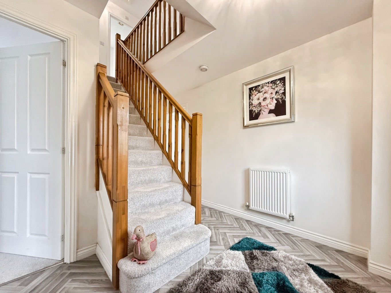 Wooden effect flooring, radiator, carpeted stairs to first floor, under stairs storage cupboard, doors into: