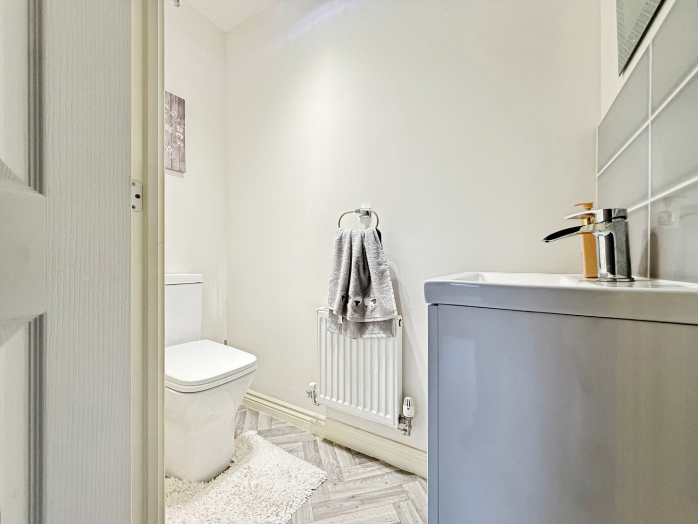 Fitted with a modern two piece suite comprising of W/C, sink set in vanity unit with tiled splash back, extractor fan, vinyl flooring, radiator.