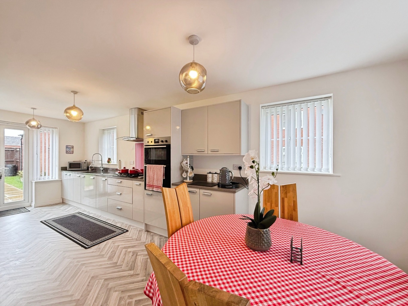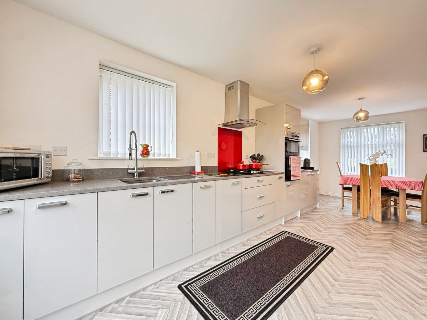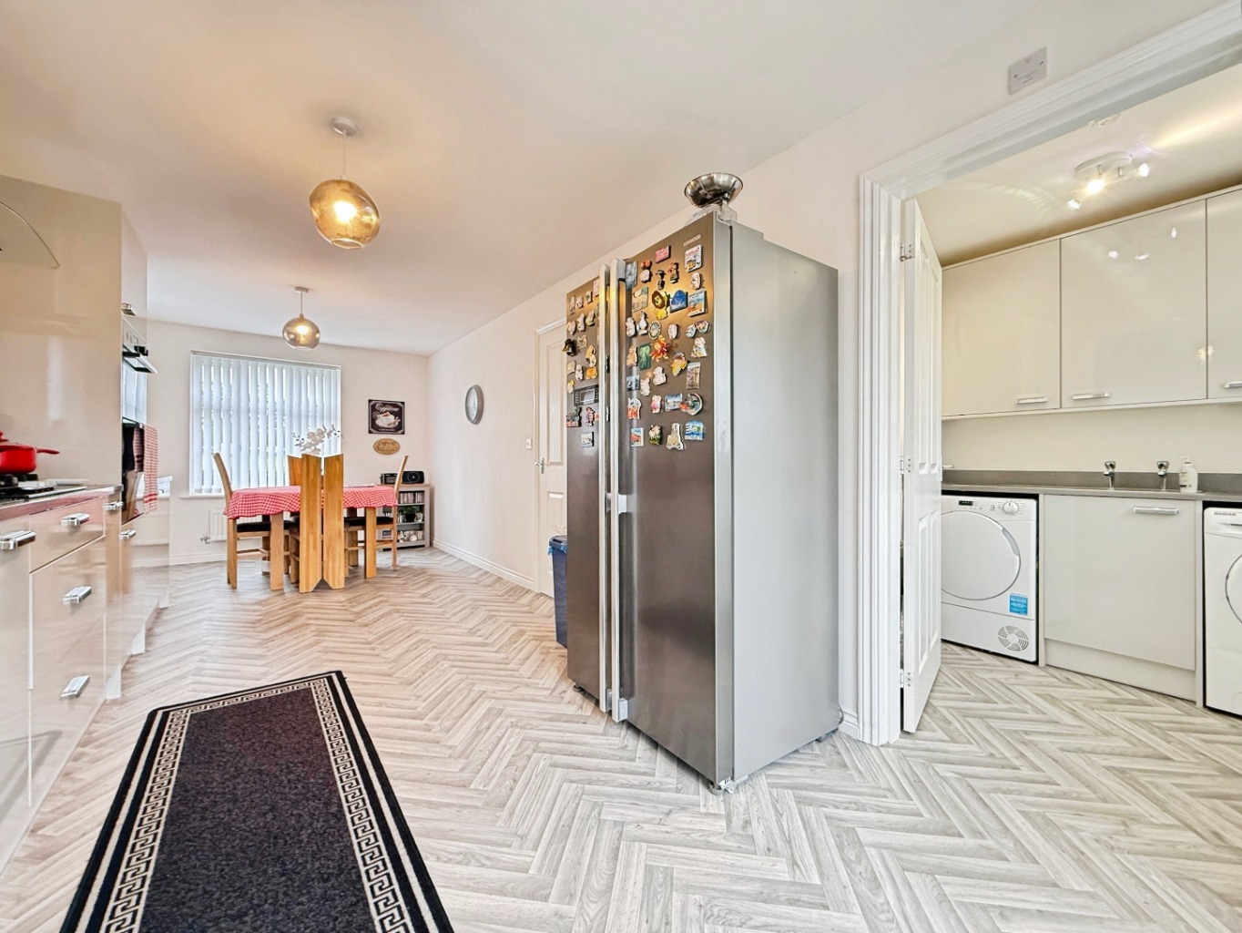The heart of the home is the impressive recently fitted kitchen, finished in sleek high-gloss units with luxurious quartz worktops. Designed with both practicality and modern aesthetics in mind, the kitchen offers ample storage and preparation space, complemented by a separate utility room for added convenience.
