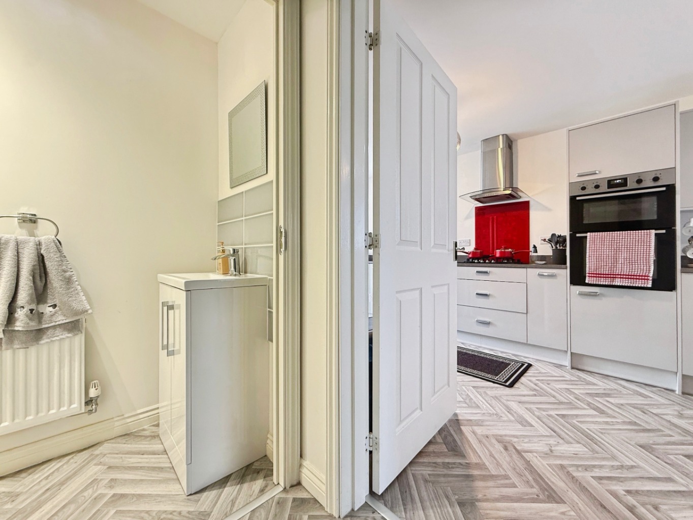 Fitted with a recently upgraded range of modern wall and base units in high gloss with complimentary quartz work surface over and matching up-stands, inset stainless steel sink with mixer tap and integrated drainer grooves to work surface, four ring gas hob with extractor over and acrylic splashback, integrated eye level oven and grill, integrated dishwasher, space for freestanding American style fridge/freezer uPVC double glazed French doors with matching side panels to rear garden, vinyl flooring, uPVC double glazed window to front elevation uPVC double glazed window to side elevation to side x2, radiator, door into: