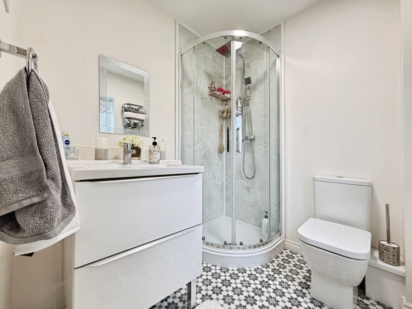 Fitted with a ultra modern three piece suite comprising of W/C, sink set in vanity unit, corner shower cubicle housing mains shower, vinyl flooring, radiator, extractor fan, uPVC double glazed frosted window to front elevation.