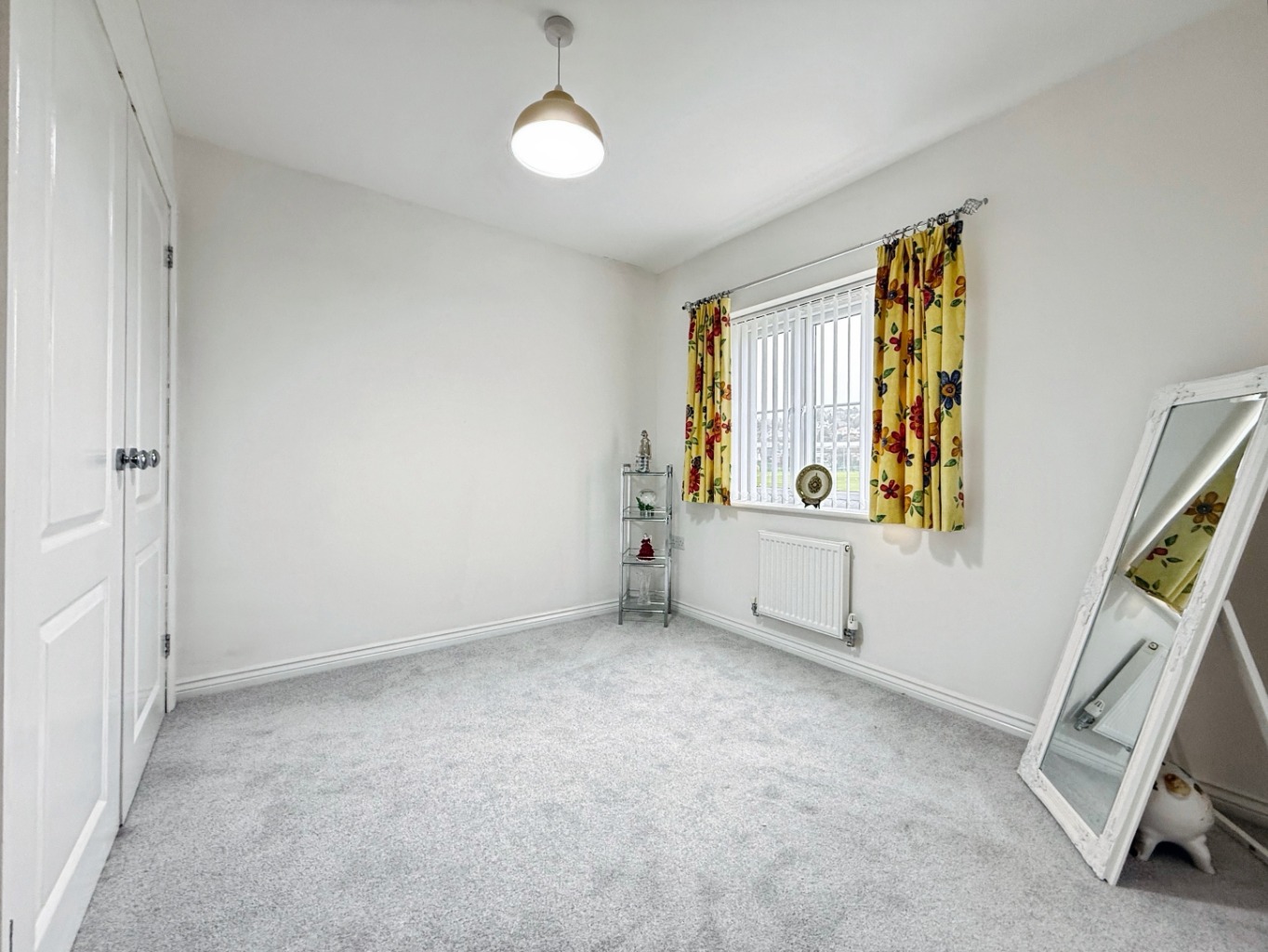 Carpeted underfoot, uPVC double glazed French doors with glazed side panels to side, radiator x2.