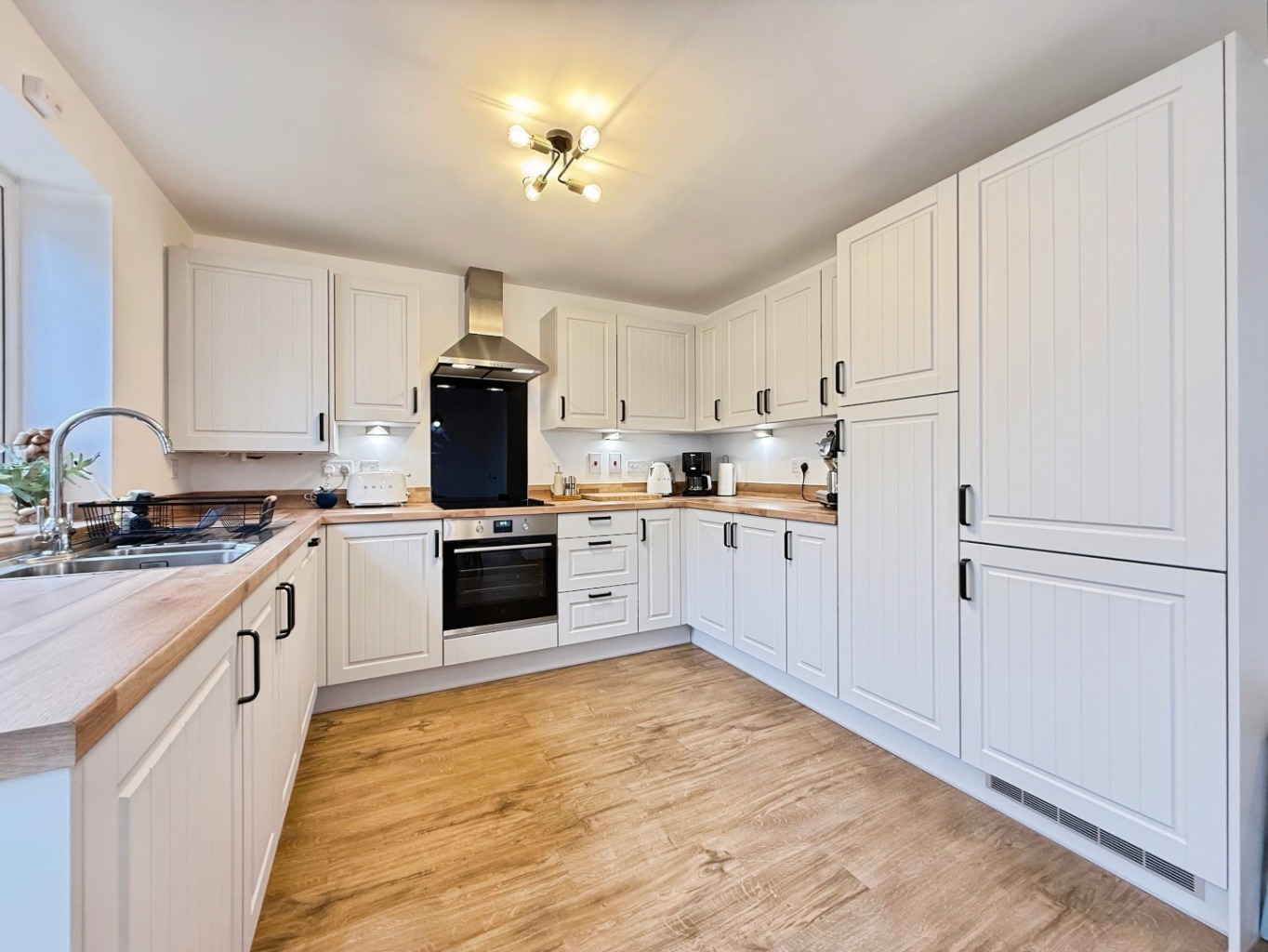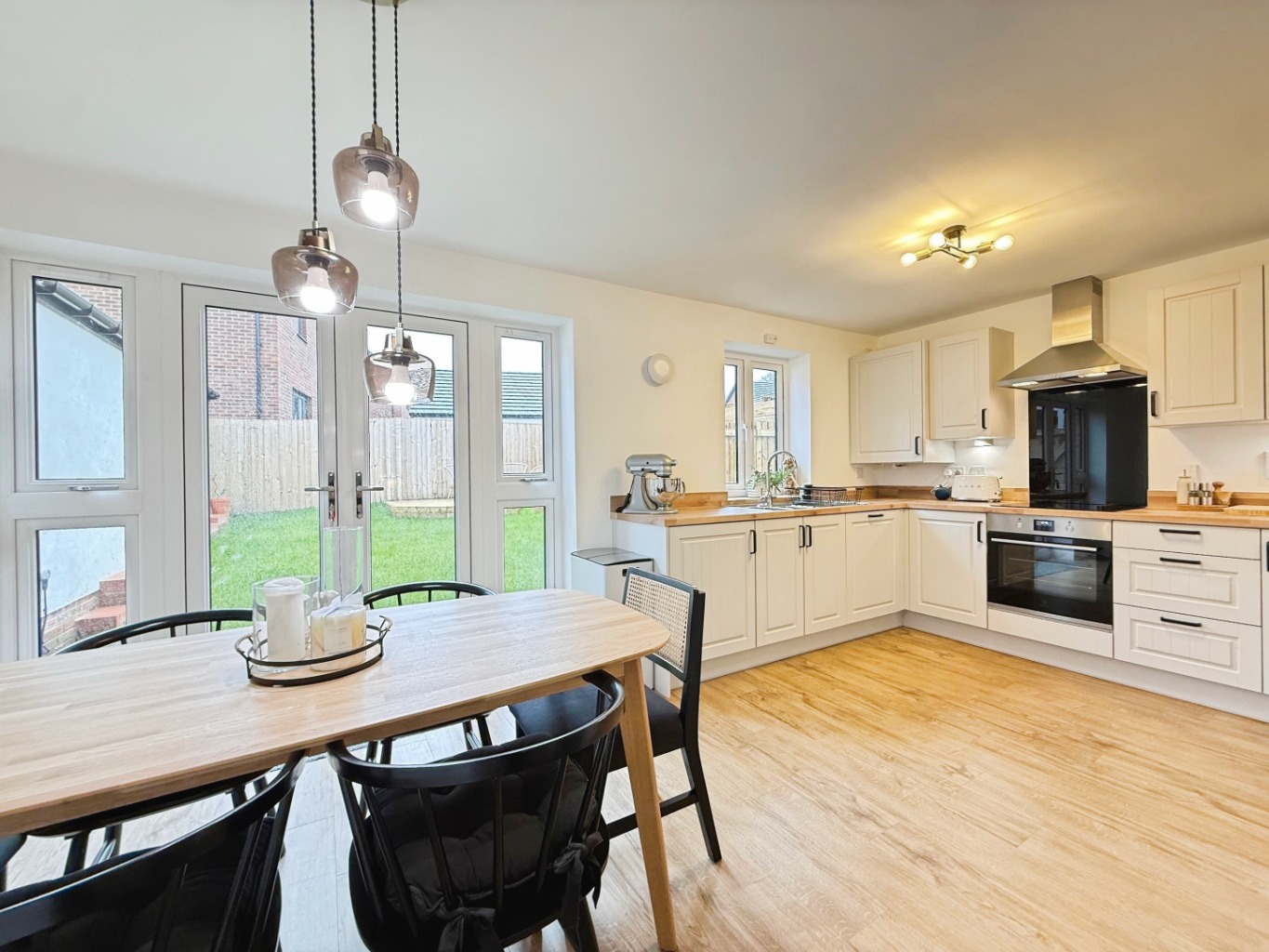 Fitted with a range of modern wall and base units in shaker style with complimentary work surface, up-stands and upgraded black handles, stainless steel 1 1/2 bowl sink with drainer and mixer tap, integrated dishwasher, induction hob with extractor over and feature acrylic splashback, integrated oven under, integrated fridge/freezer, under counter lighting, wall mounted gas combination boiler within concealed unit, LVT flooring, pantry style cupboard, radiator, uPVC double glazed window and patio doors to rear elevation with glazed side panels, door into: