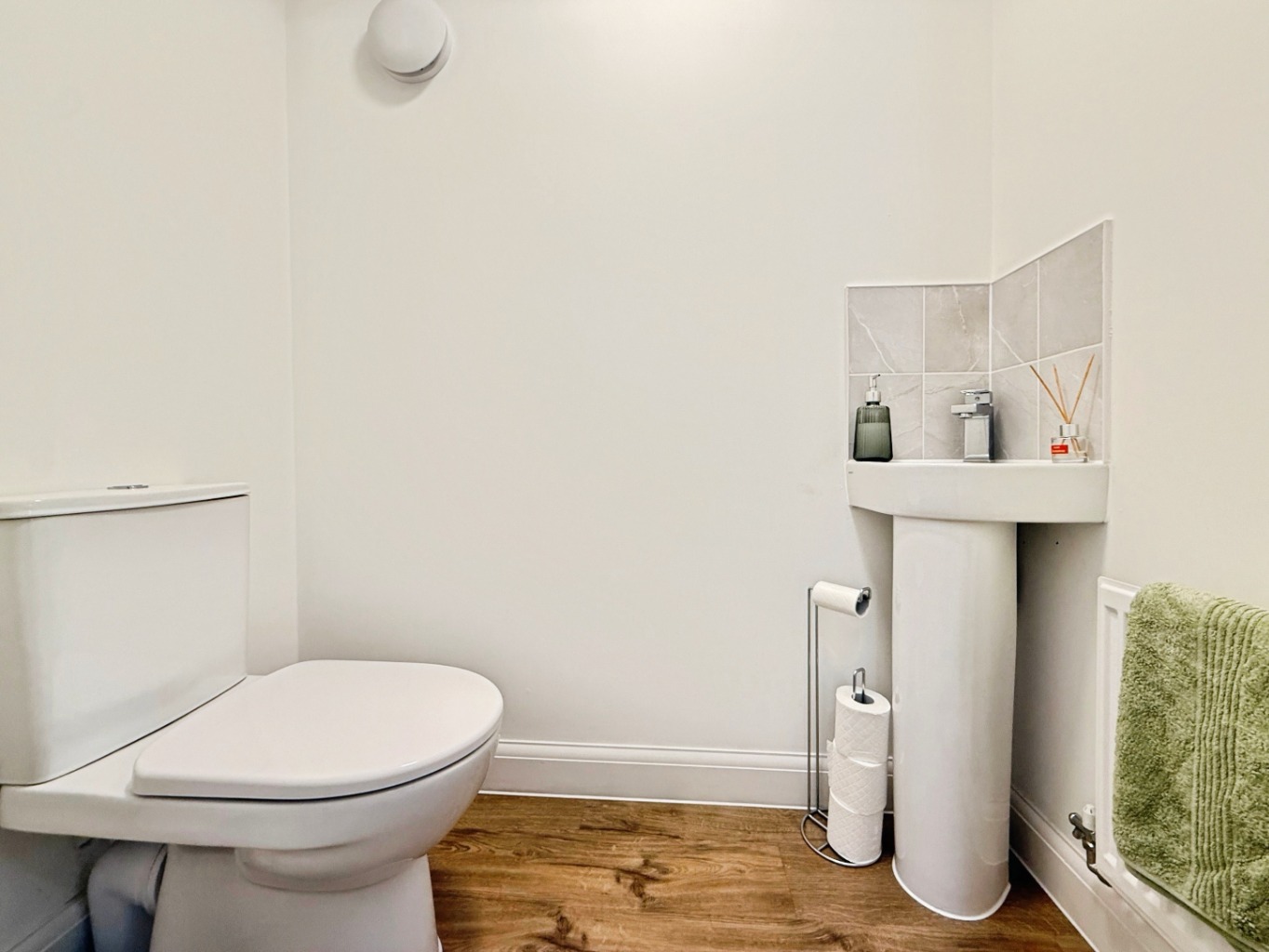 Fitted with a white two piece suite comprising of W/C, pedestal wash hand basin with tiled splash back, radiator, LVT flooring.