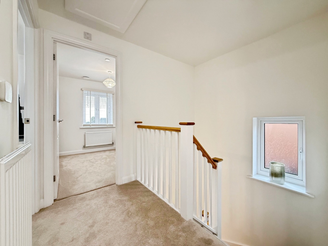 Carpeted underfoot, loft access, airing cupboard, uPVC double glazed window to side elevation, radiator, doors into: