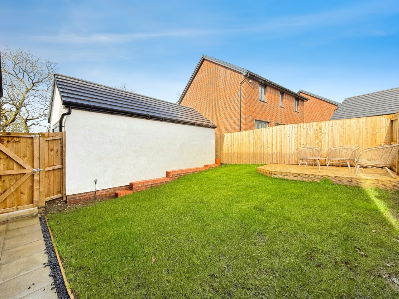 To the rear of the property there is a low maintenance, fully enclosed garden featuring a slabbed area, mature lawn and corner sun deck area.