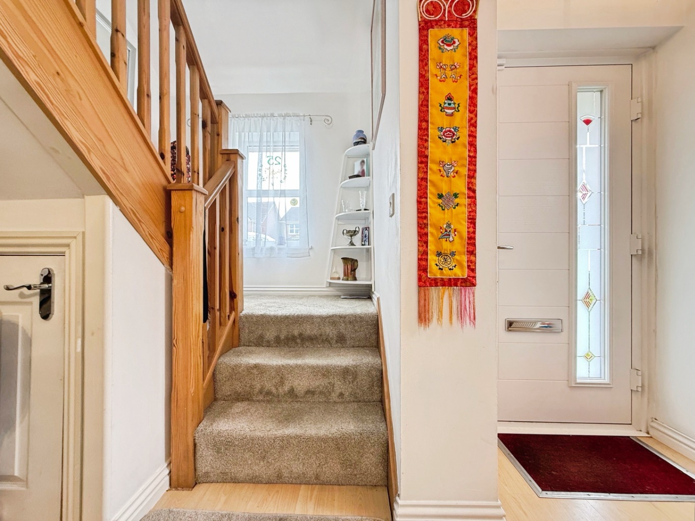 The property benefits from a private driveway and integral garage, with an inviting porch leading into a welcoming hallway. A striking feature staircase with glazed windows to the front creates an immediate sense of light and style upon entering the home. Internal access to the integral garage is also available from the hallway.