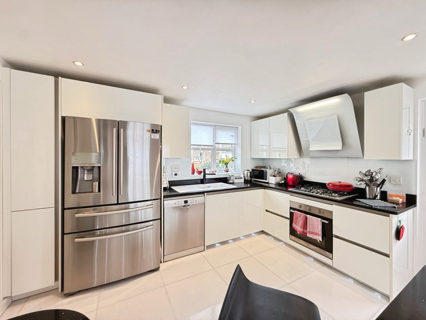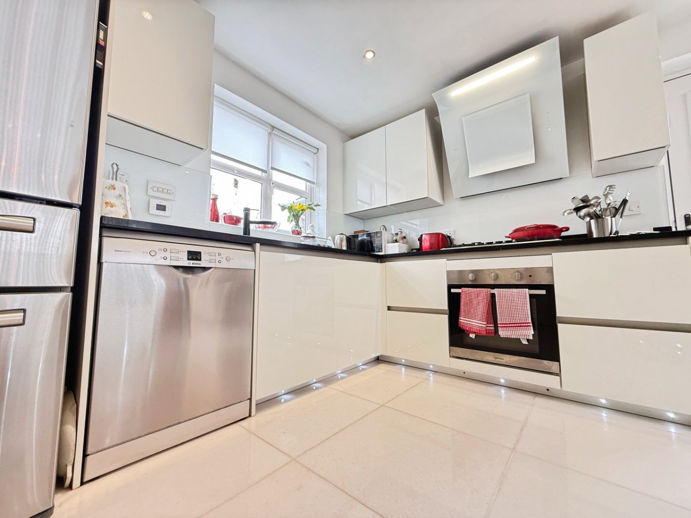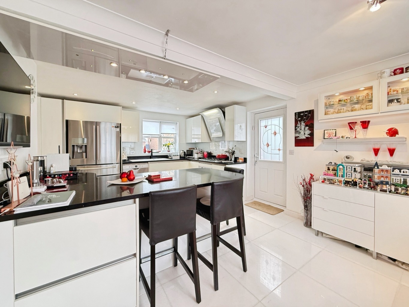 Fitted with a range of modern wall and base units in white high gloss 'tru handleless' units with complimentary 'quartz' work surface over, 1 1/2 bowl white composite sink with mixer tap, integrated five ring gas hob with modern digital extractor above with oven under, freestanding dishwasher to remain, freestanding American style fridge/freezer to remain, white glass splashback, plinth lighting, tiled marble flooring, breakfast bar area with curved 'quartz' work surface and overhang, integrated wine fridge, feature lighting, spotlights to ceiling, underfloor heating, complimentary white gloss units to dining area, uPVC double glazed window to rear elevation, composite side door, double doors into: