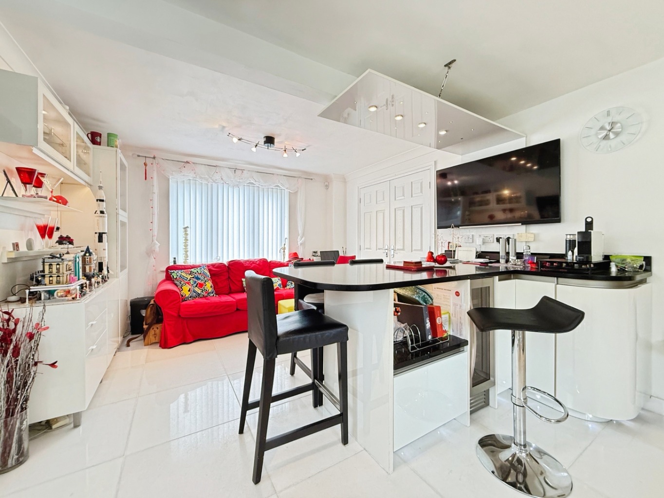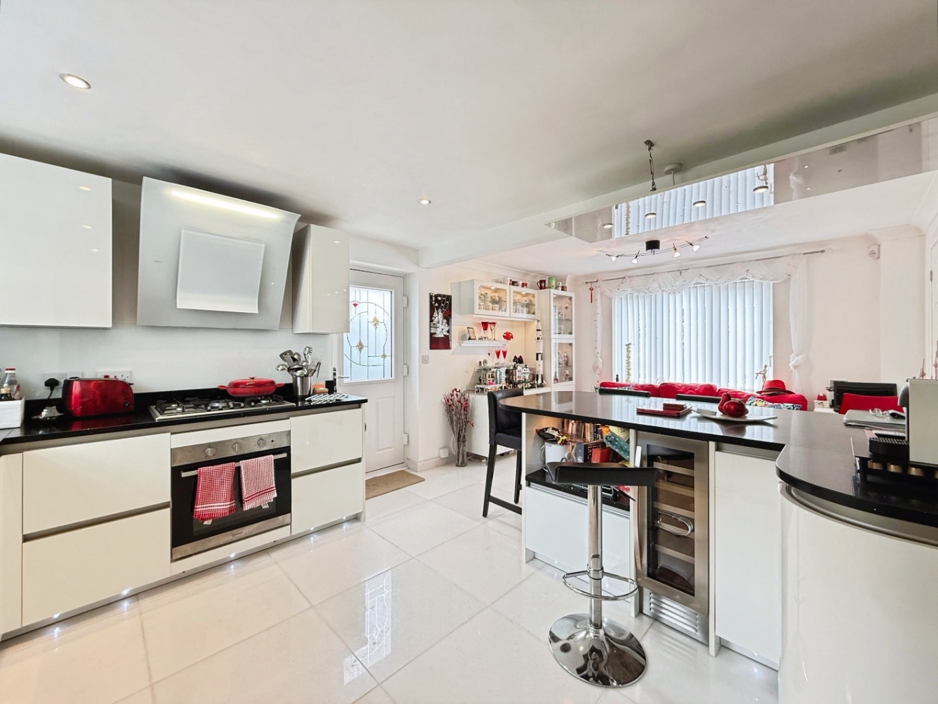 At the heart of the property is a stunning contemporary kitchen, fitted with modern high-gloss true handleless white units complemented by elegant granite work surfaces. The kitchen is superbly equipped with a wine cooler, breakfast bar, and generous dining area, making it ideal for both everyday living and entertaining. Underfloor heating adds an extra touch of comfort, while double doors lead seamlessly into the spacious lounge.