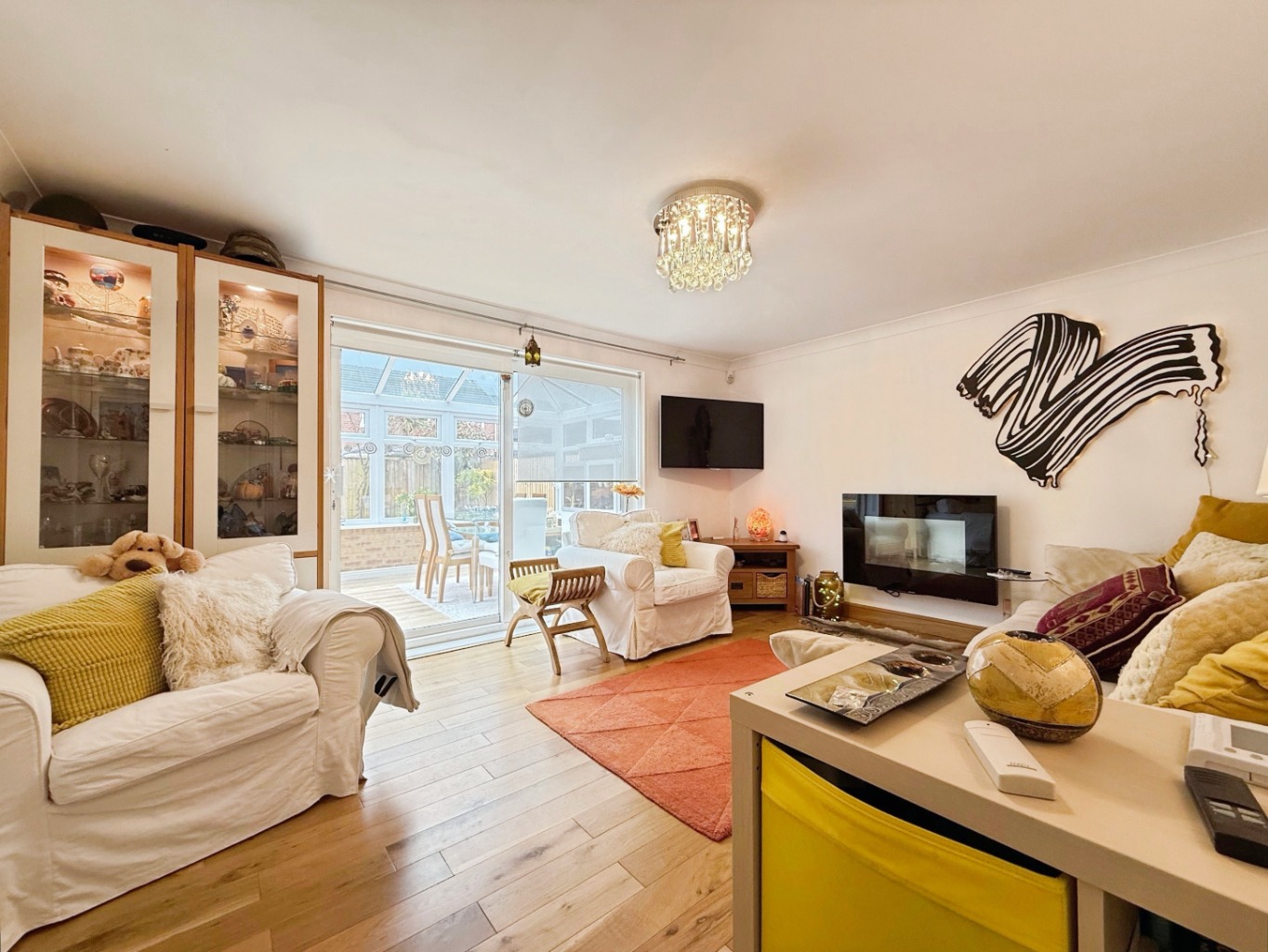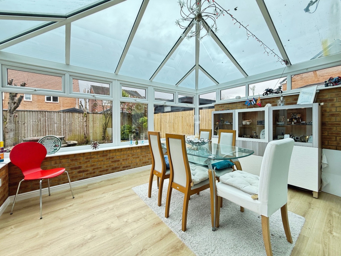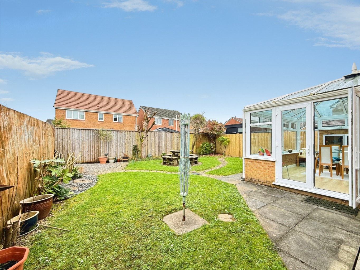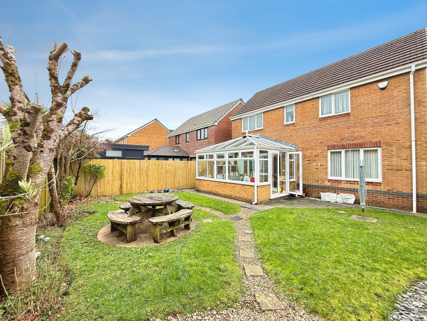 To the rear, a bright conservatory provides additional living space and enjoys patio doors opening onto the enclosed, low-maintenance rear garden—perfect for relaxing or hosting guests.