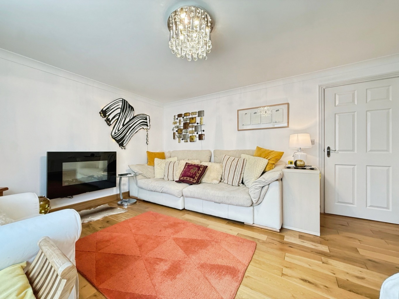 Solid oak engineered flooring, radiator x2, wall mounted electric fire effect unit, uPVC double glazed sliding doors into: