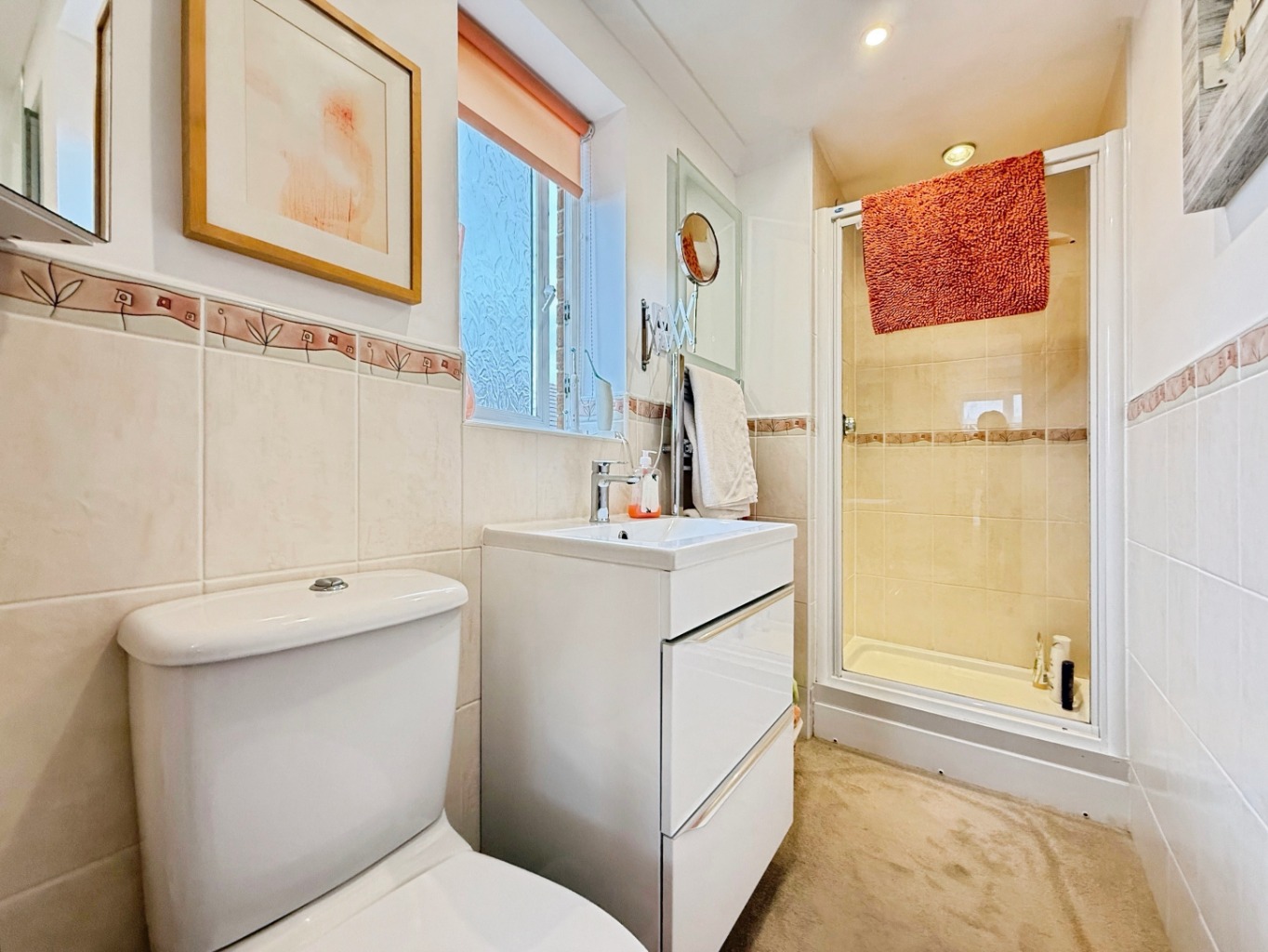 Fitted with a white three piece suite comprising of W/C, sink set in vanity unit, shower enclosure with power shower, partly tiled walls, spotlights to ceiling, radiator, carpeted underfoot, uPVC double glazed frosted window to side elevation.