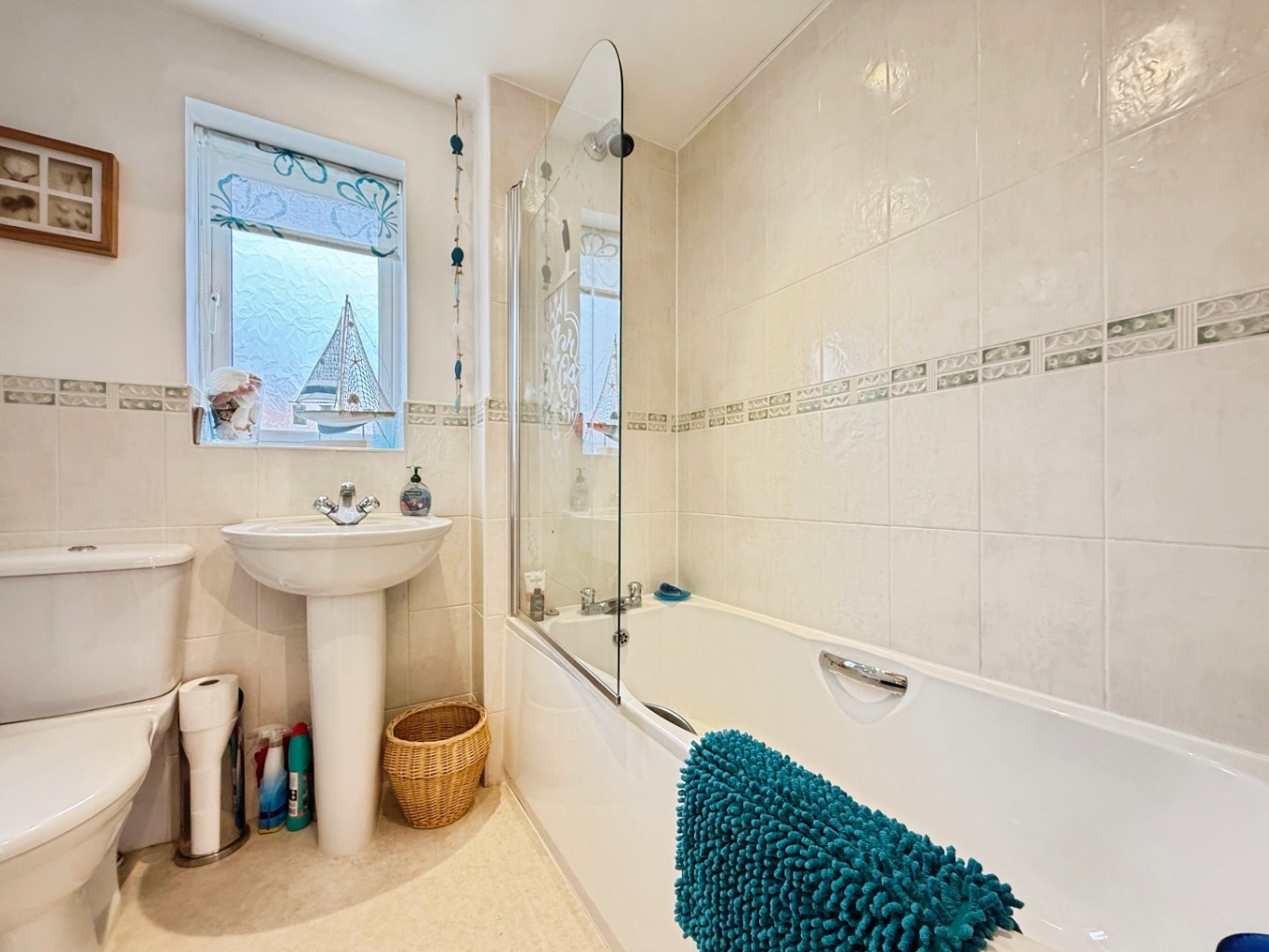 Fitted with a white three piece suite comprising of W/C, pedestal wash hand basin, paneled bath with shower overhead, glass modesty screen, partly tiled walls, radiator, uPVC double glazed frosted window to rear elevation.