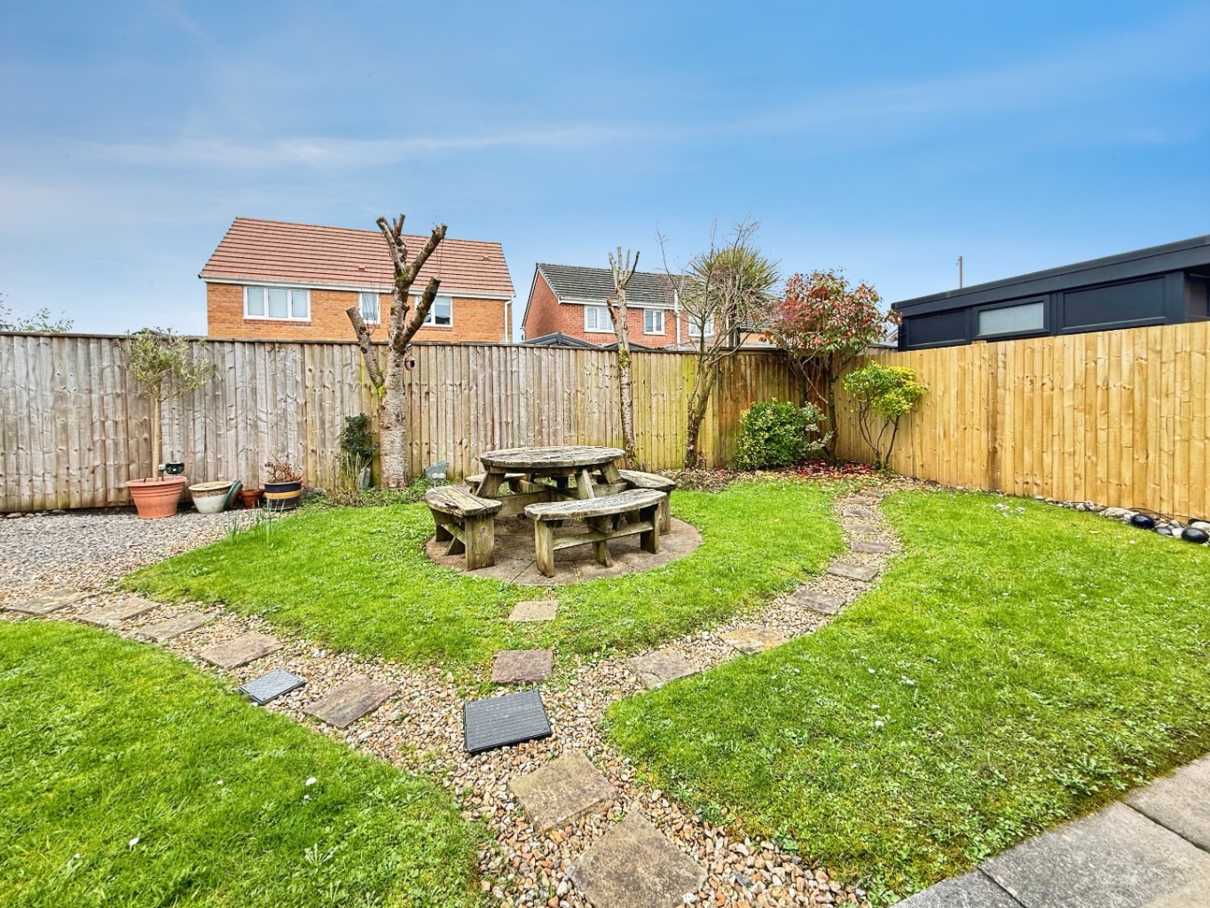 Externally, the rear garden has been designed for ease of upkeep while still providing an attractive outdoor space.