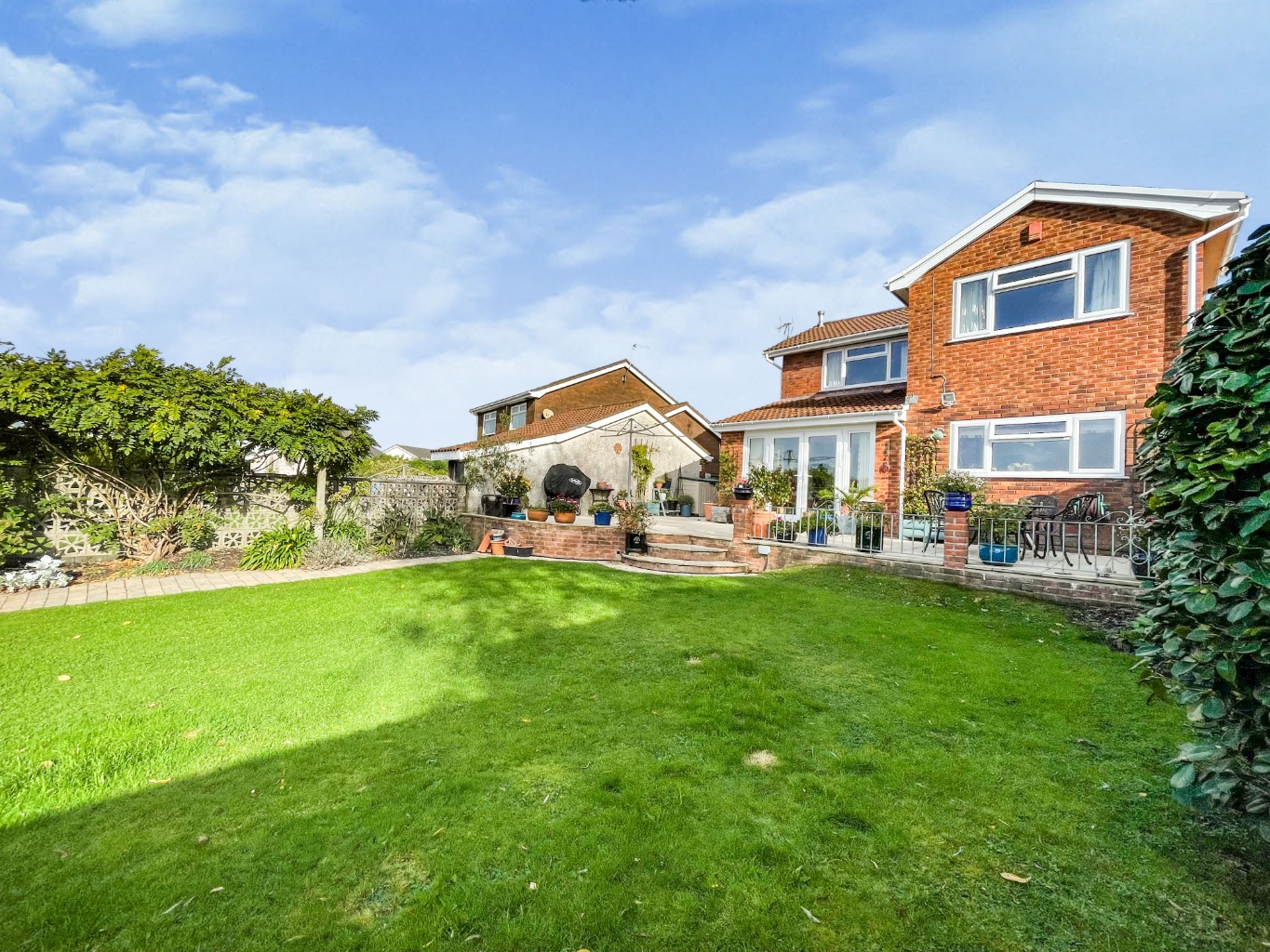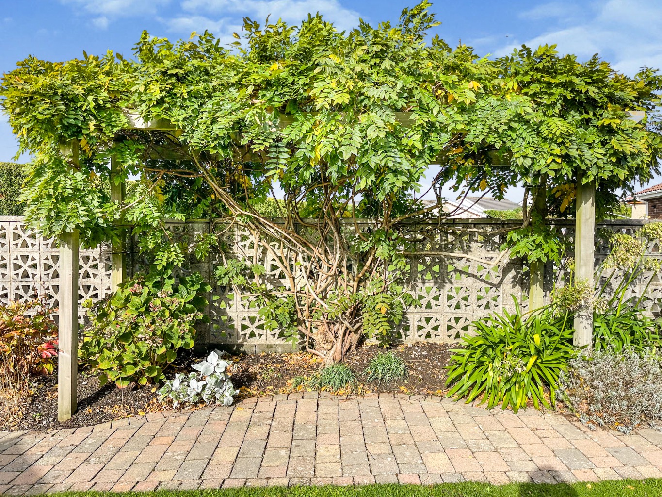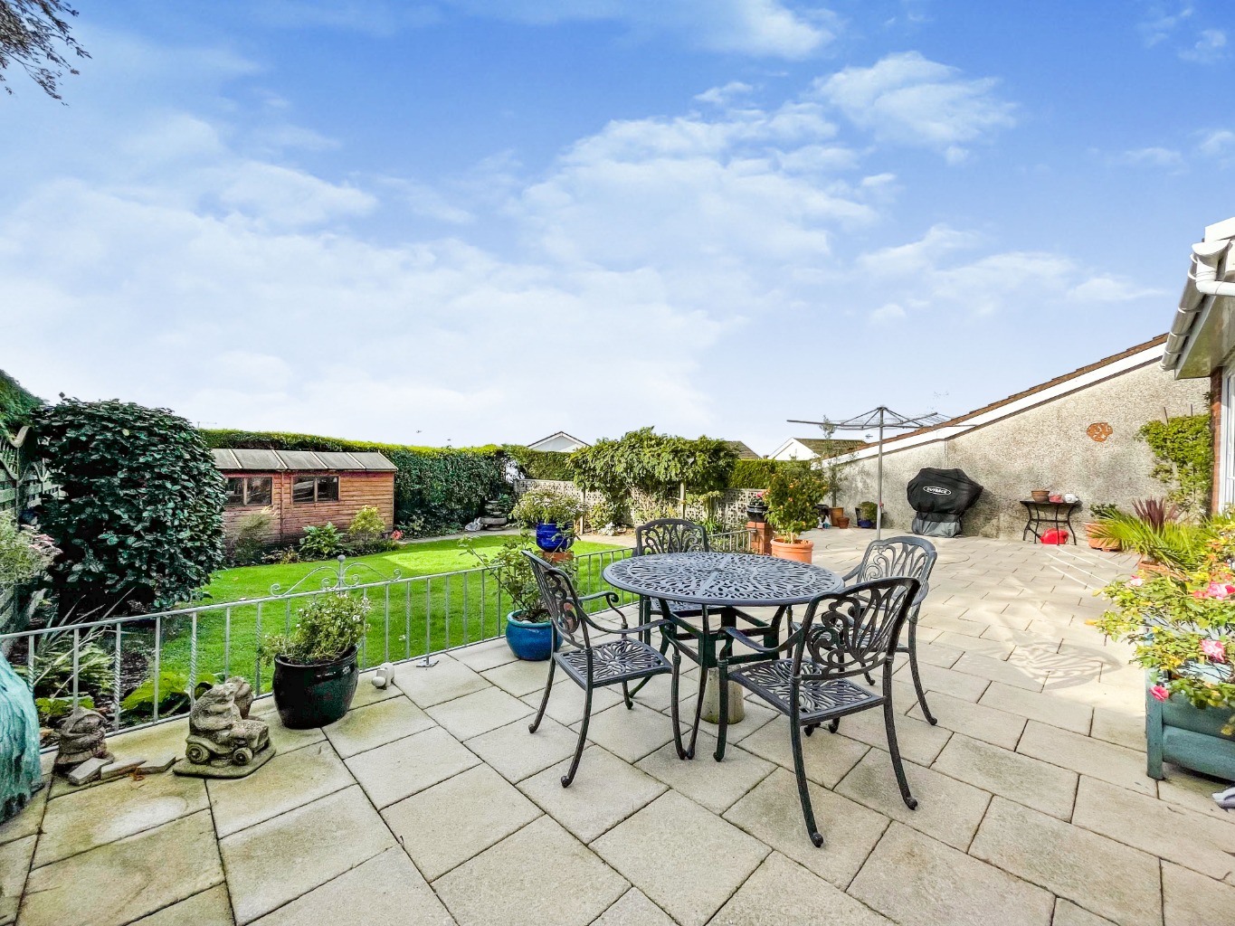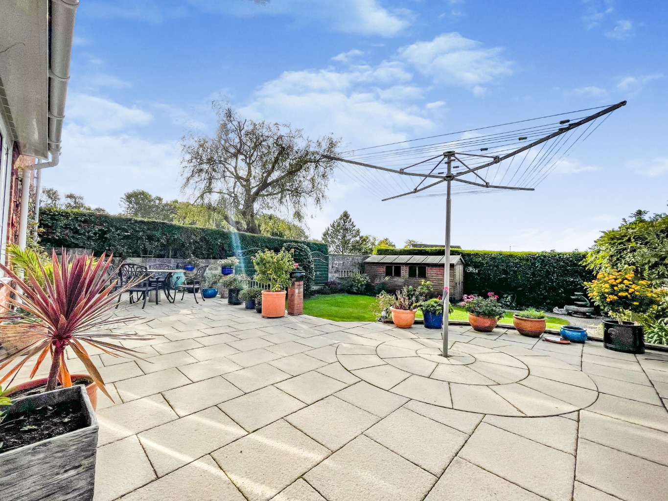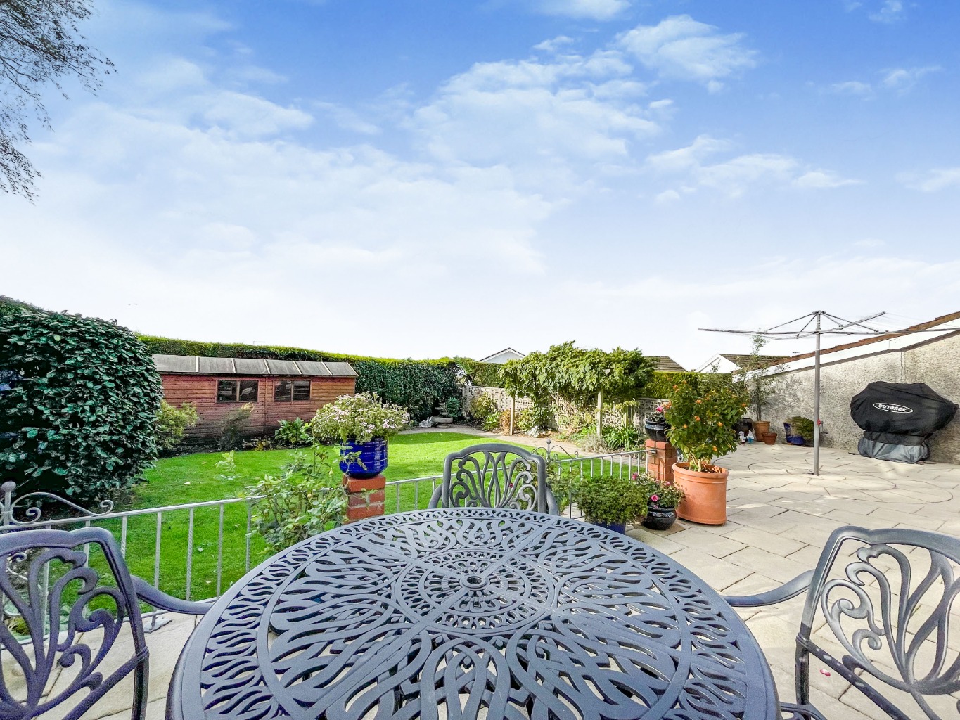 The sunny south facing rear garden boasts an array of mature plant and shrub borders and beautiful wisteria that is growing on a wooden pergola. There is also an electric water feature, wooden storage shed, good size lawn and a large paved patio that leads to the secure garage.