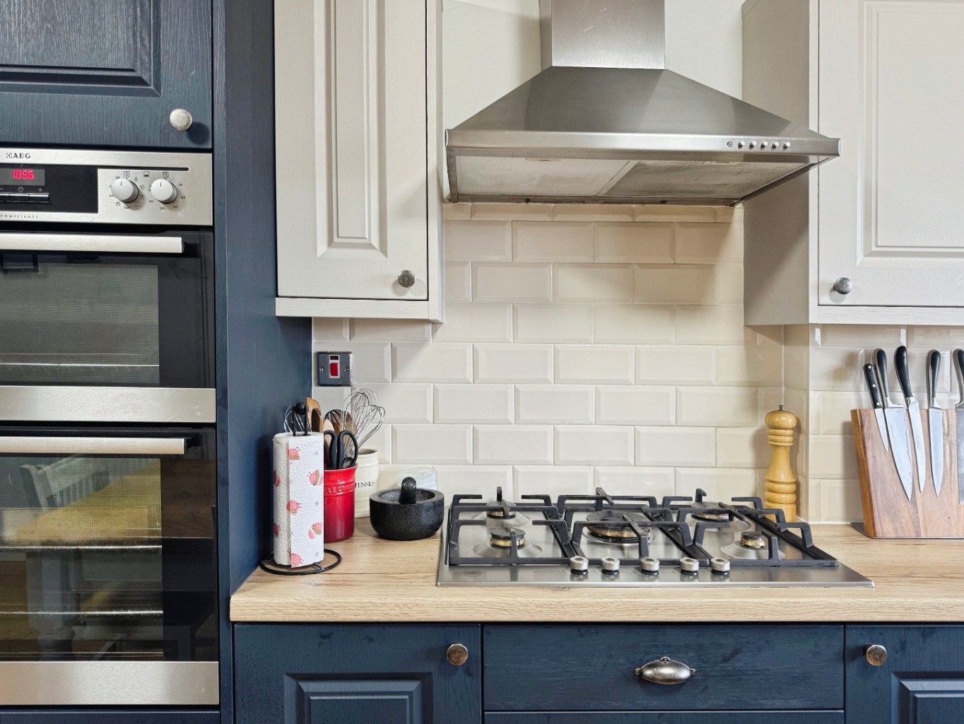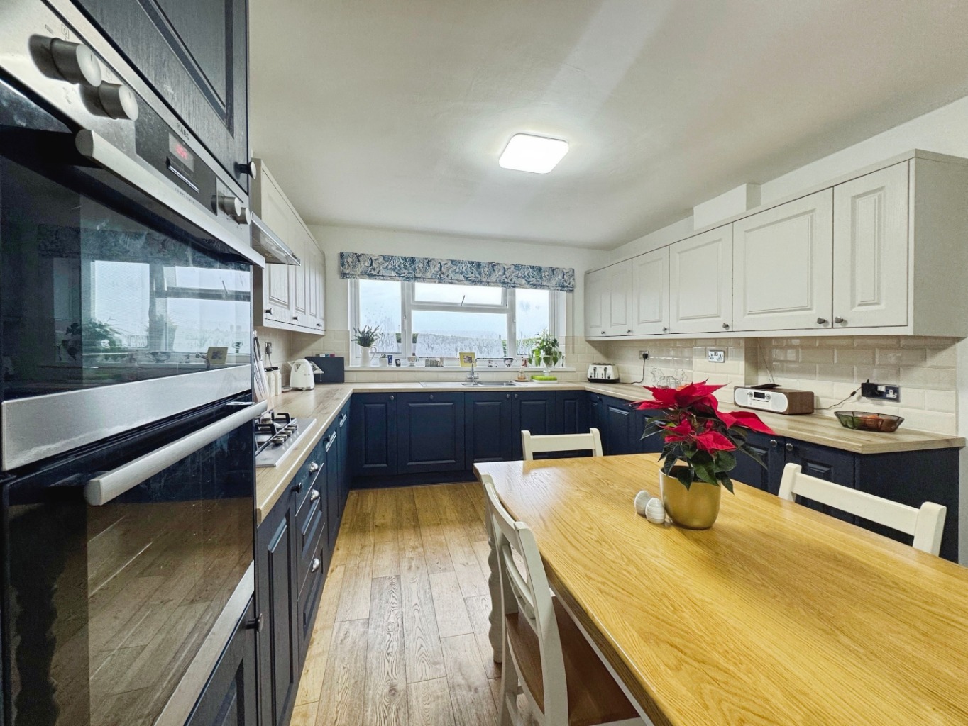 Fitted with a range of recently fitted modern shaker style wall and base units with work surface over, five ring gas hob with extractor fan over, eye level double oven/grill, integrated dishwasher, stainless steel 1 and 1/2 bowl sink with drainer and mixer tap, integrated microwave, integrated fridge/freezer, solid oak flooring, radiator, uPVC double glazed window, obscure uPVC double glazed door, under plinth heating.