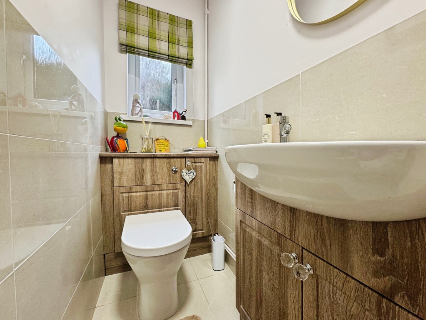Fitted with a two piece suite comprising of vanity unit housing wash hand basin and a separate vanity unit housing W.C, tiled floor, obscure uPVC double glazed window, automatic sensored lighting, radiator, part tiled walls.