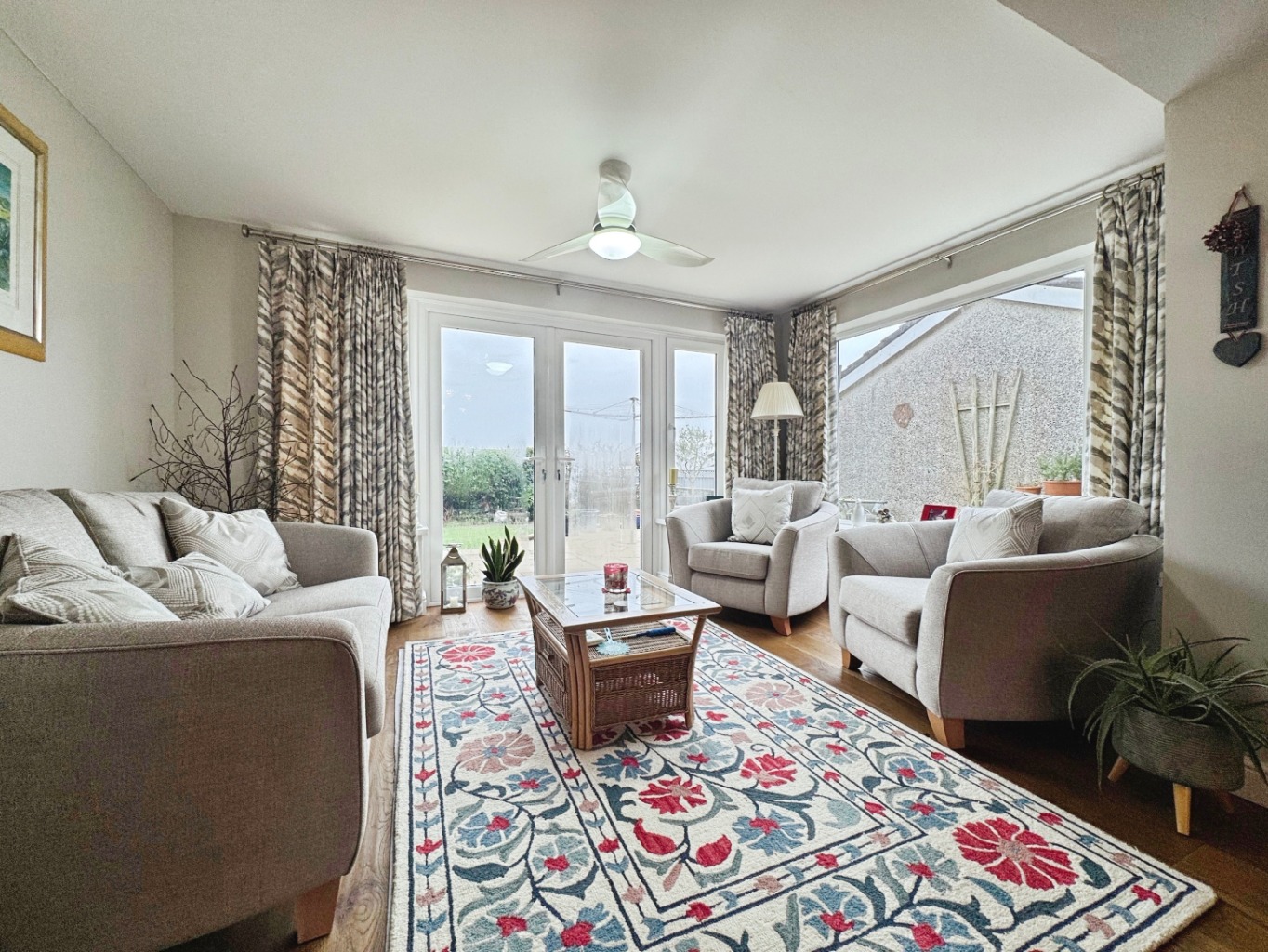 uPVC double glazed window, uPVC double glazed french doors with uPVC double glazed windows to side, wood effect laminate flooring, fan ceiling light, radiator.