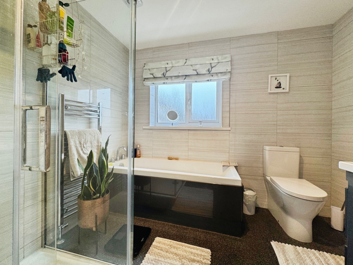 Fitted with a modern four piece suite comprising of bath, walk in rainwater shower, w.c and high gloss vanity unit housing wash hand basin, tiled walls, vinyl flooring, mirror with fitted light, chrome heated towel rail x2, obscure uPVC double glazed window, extractor fan, door to airing cupboard housing gas combination boiler with full service history.