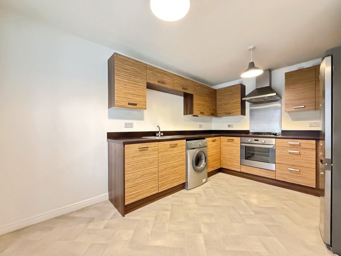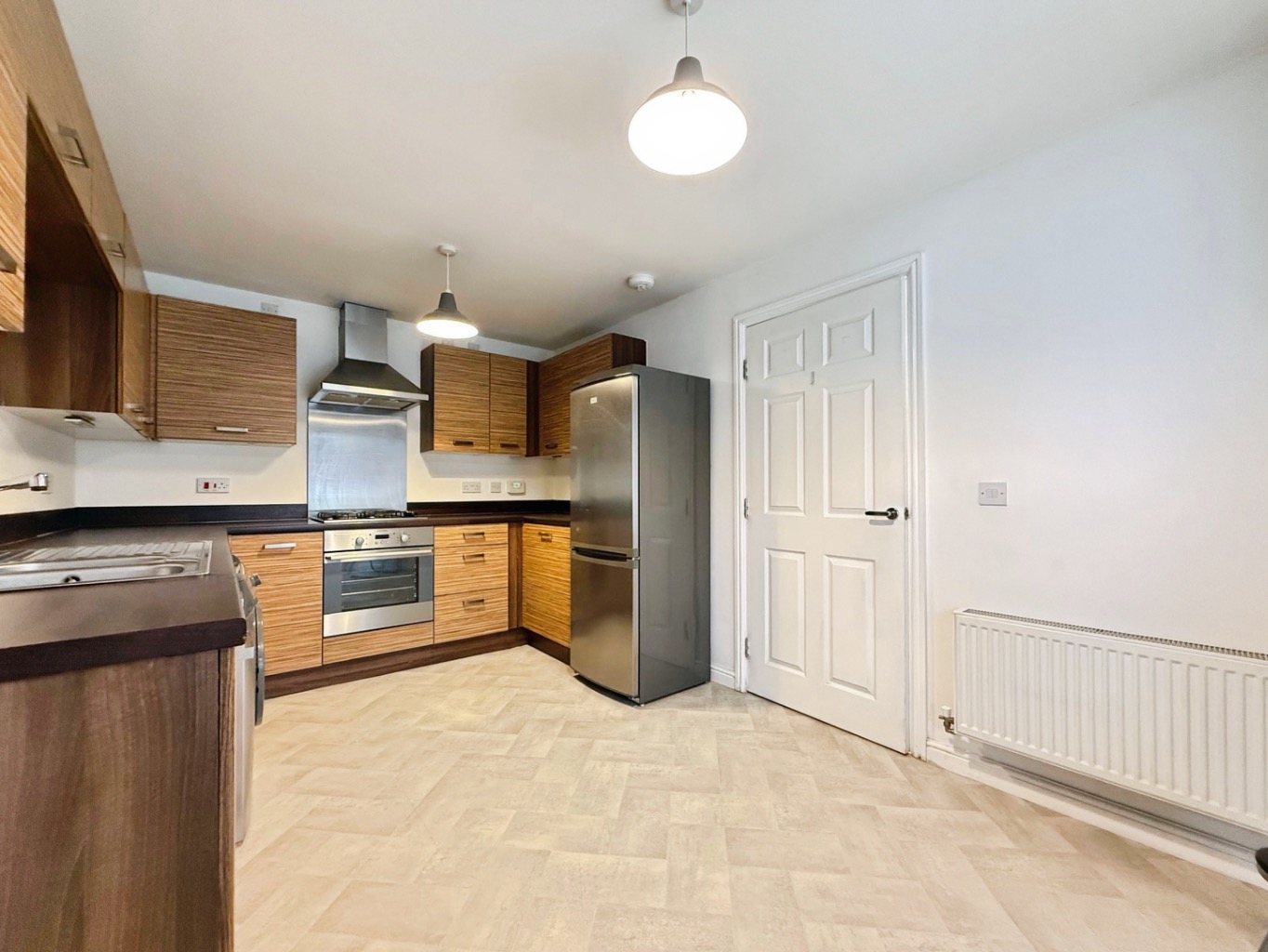 Fitted with a range of matching wall and base units with complimentary work surface over, stainless steel sink with mixer tap, four ring gas hob with splash back and extractor over, integrated oven, integrated dishwasher, space for freestanding fridge/freezer.