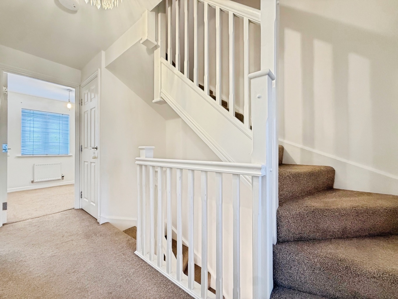Carpeted underfoot, airing cupboard, cupboard housing hot water tank, carpeted stairs to second floor accommodation, doors into: