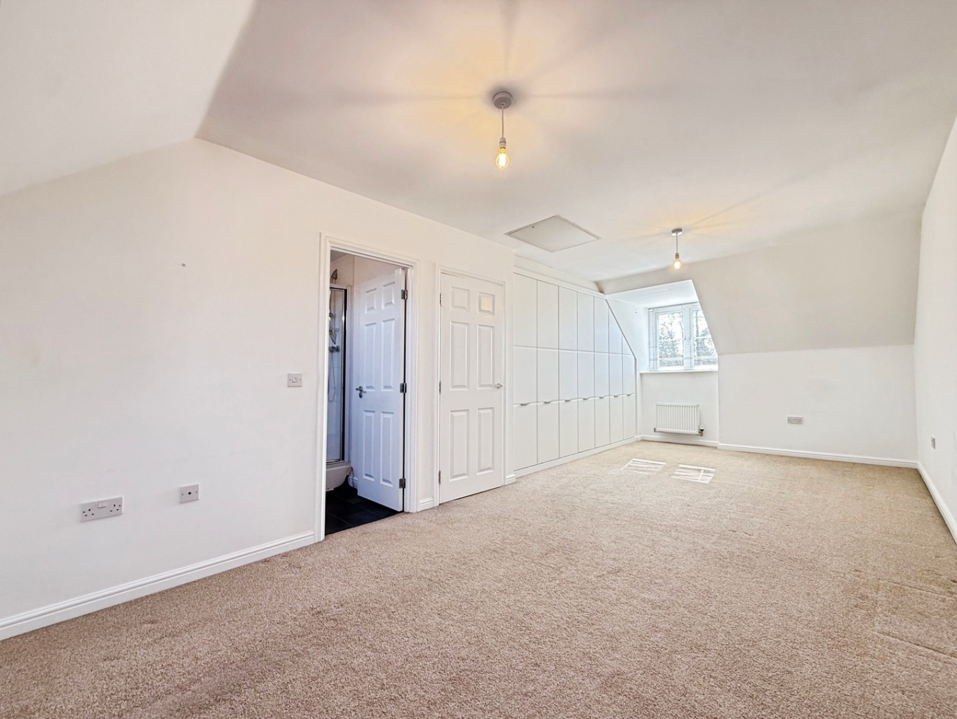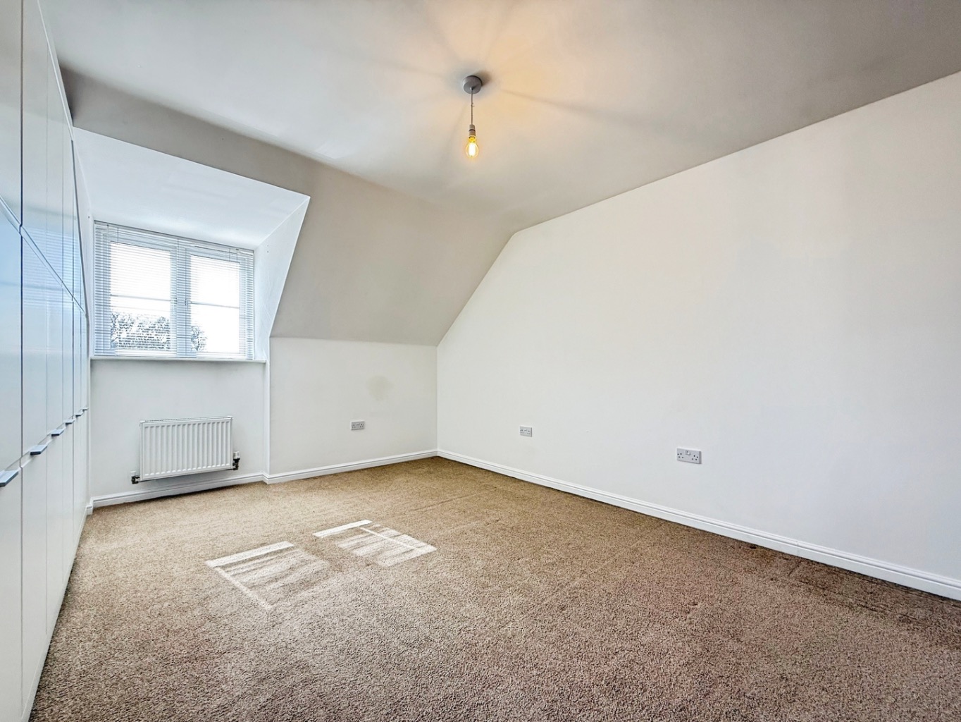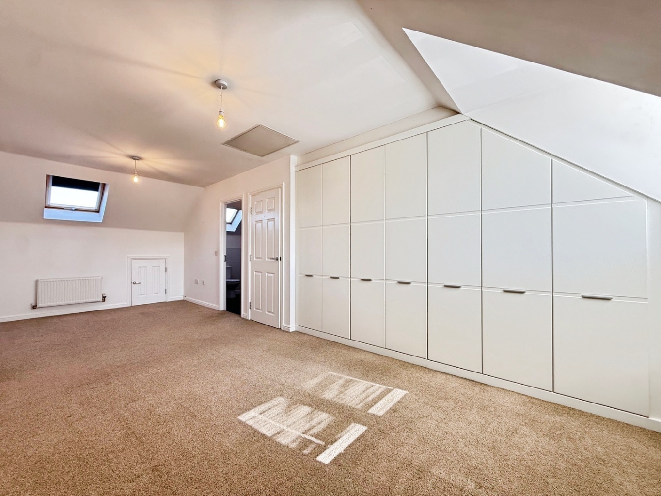 Carpeted underfoot, uPVC double glazed window to front elevation, velux window, radiator, fitted wardrobes, built in storage cupboard housing wall mounted gas boiler.